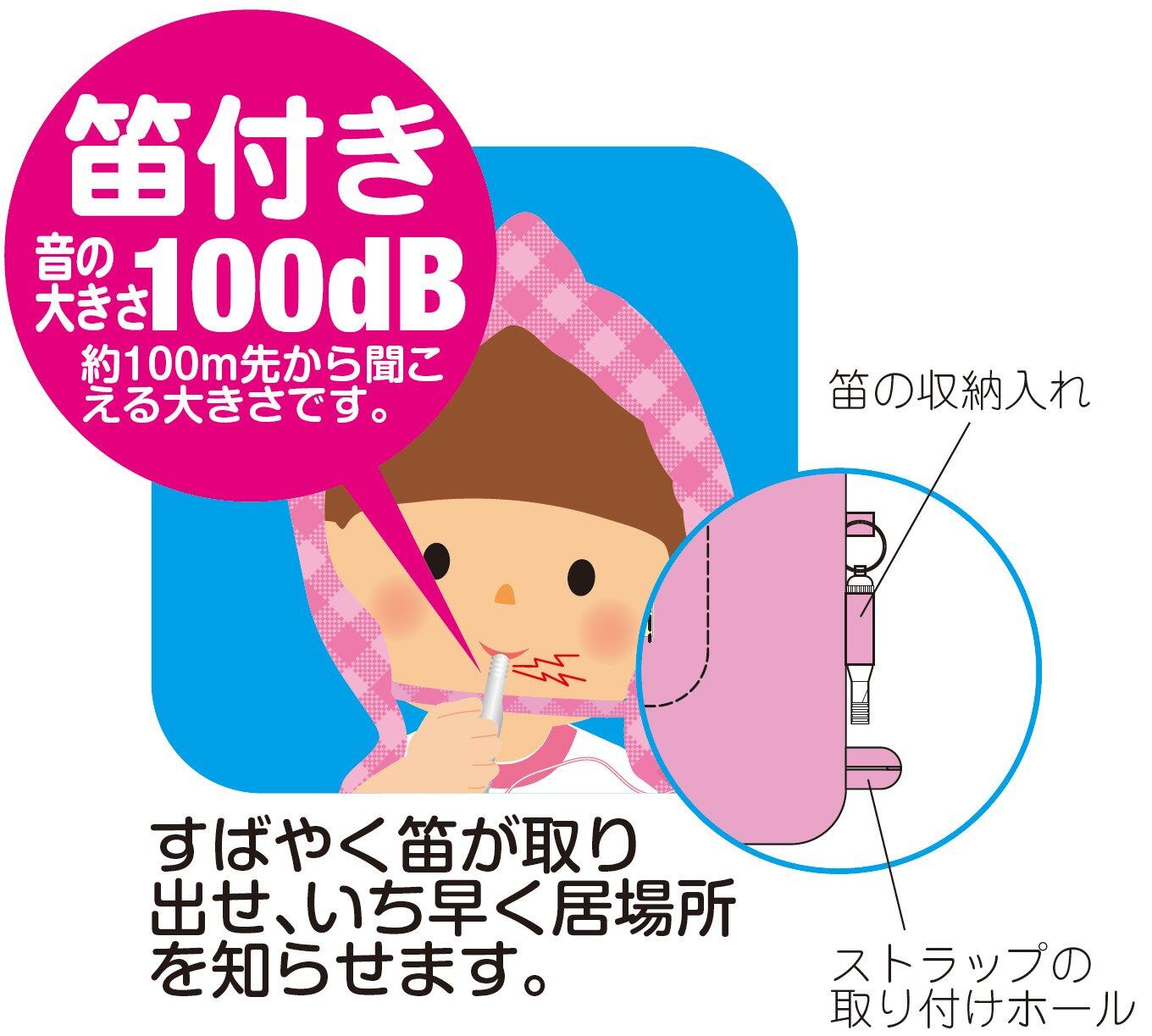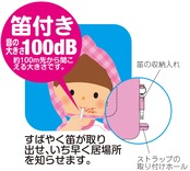 笛付(音の大きさ100dB:約100m先から聞こえる大きさです)、2つの耳穴付、連絡先が記入できる名札付き