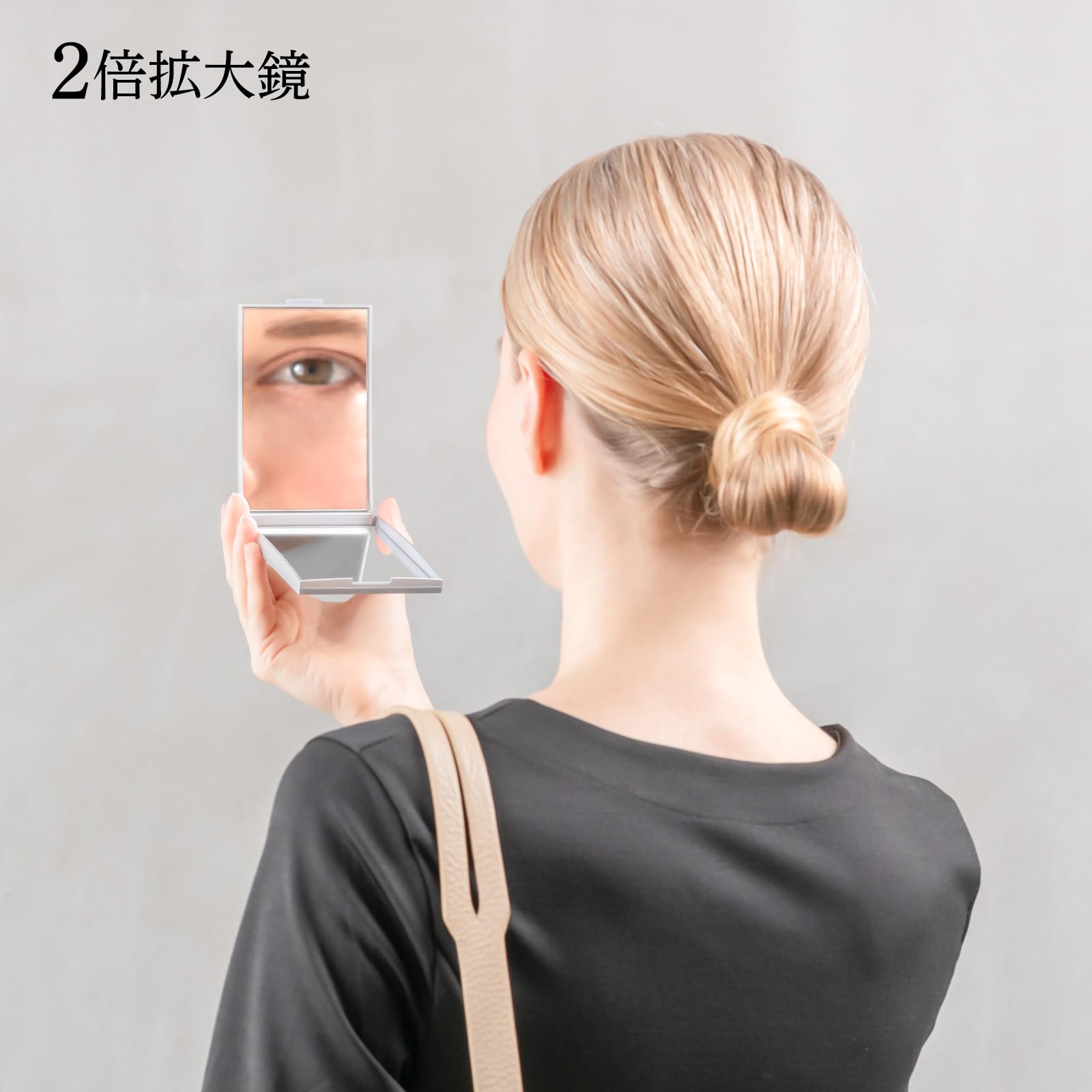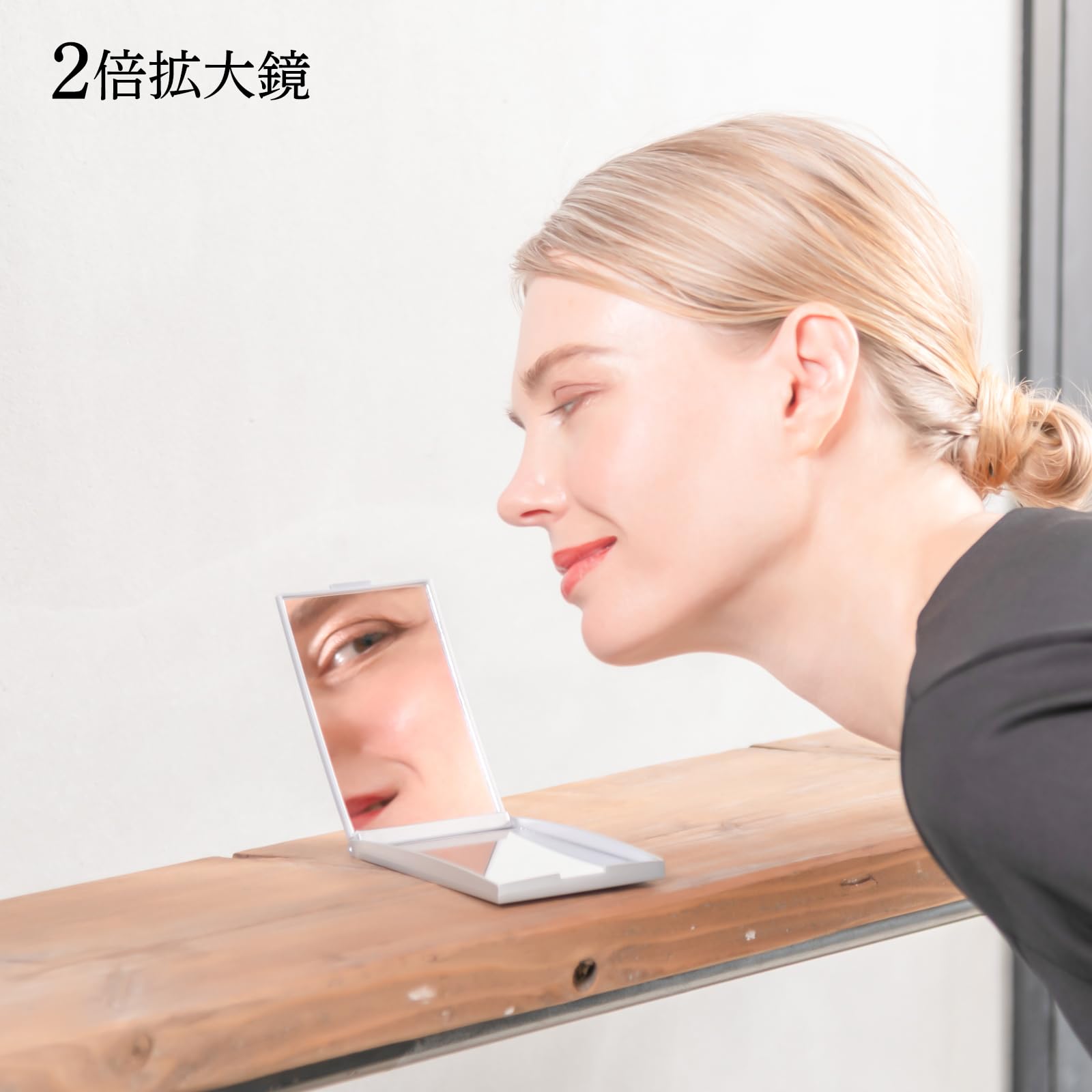 【2倍拡大鏡】等倍鏡と2倍拡大鏡がセットになった両面コンパクトミラーです。2倍拡大鏡は細部まで大きく見えて角栓・シミ・シワなどお肌のお手入れに最適です。また、コンタクトレンズの装着の時にも役立ちます。