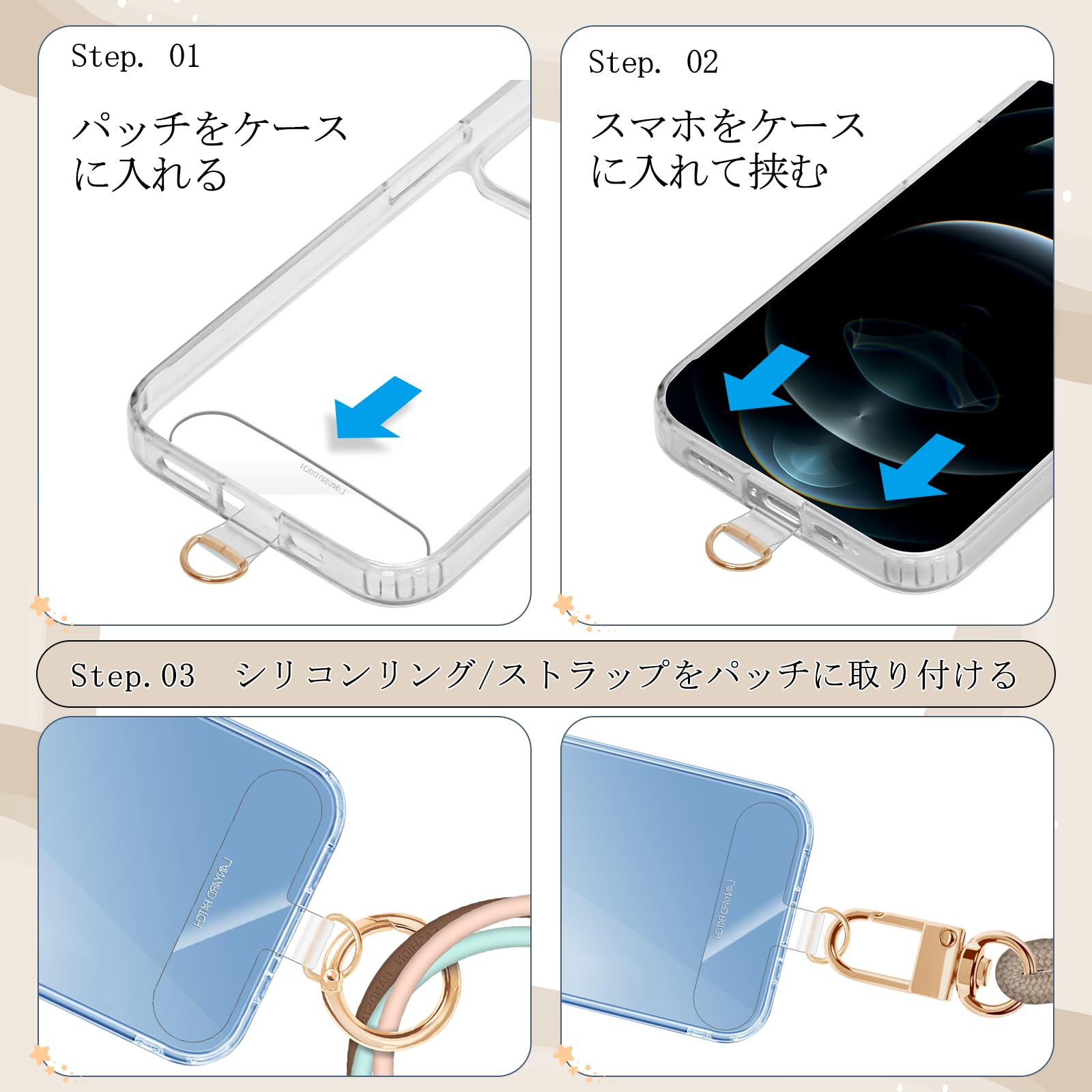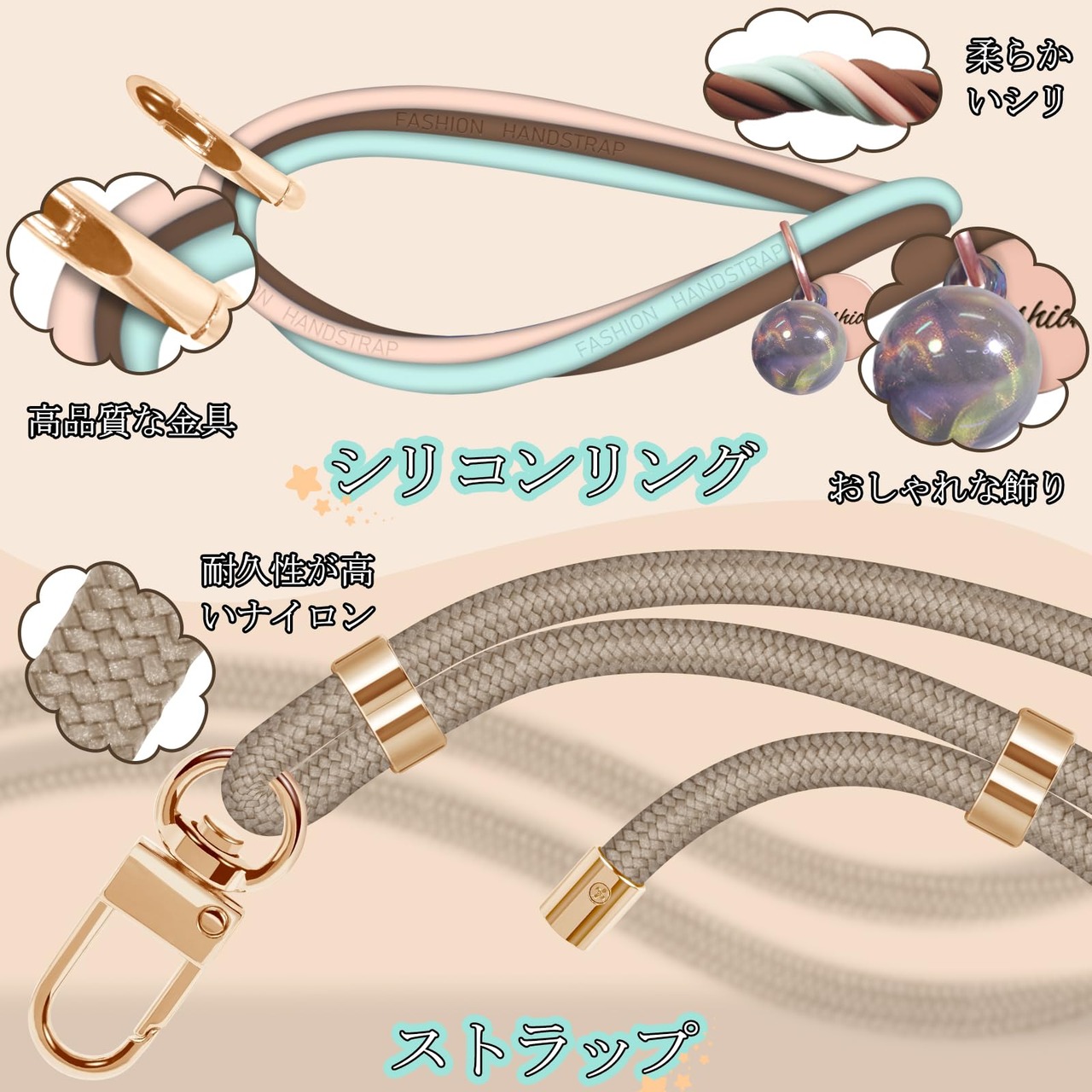 「素材について」リングは、味がしない、汚れにくいシリコーンを使用し、伸縮性があるため長時間使っても形が変わったりしません.ストラップはナイロンという耐用性が高い素材で作られて。両方の金具も特注された高品質の形でスマホを掛けるにピッタリです、金色でピカピカなナスカンも錆びにくい特徴があり、上品さが感じられます。
