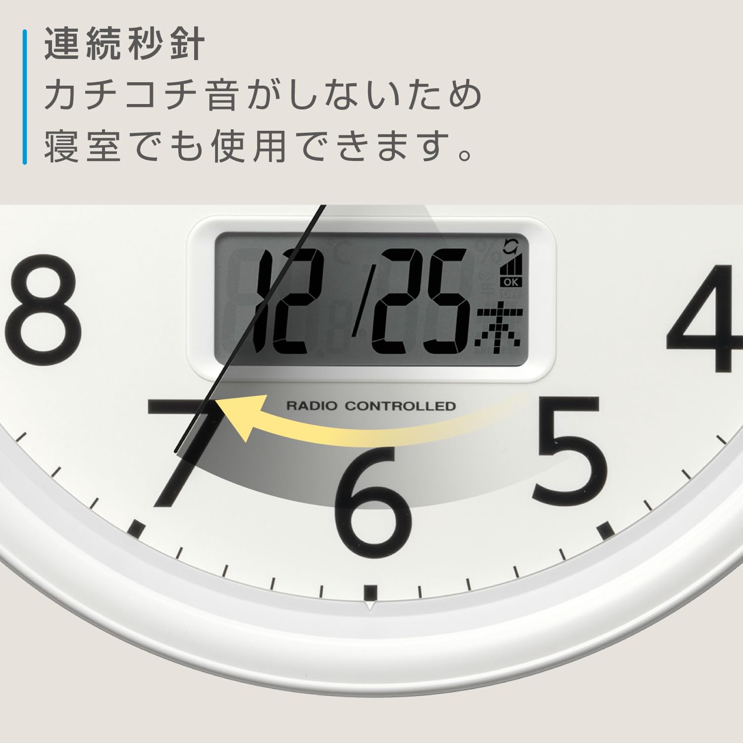 【おやすみを邪魔しない、静かな秒針】スーッと滑らかに動く連続秒針を採用。針が動くコチコチ音がしないので、寝室や静かなお部屋にもぴったりです。スムーズに動く秒針が、静かな眠りや集中時間をお手伝いします。