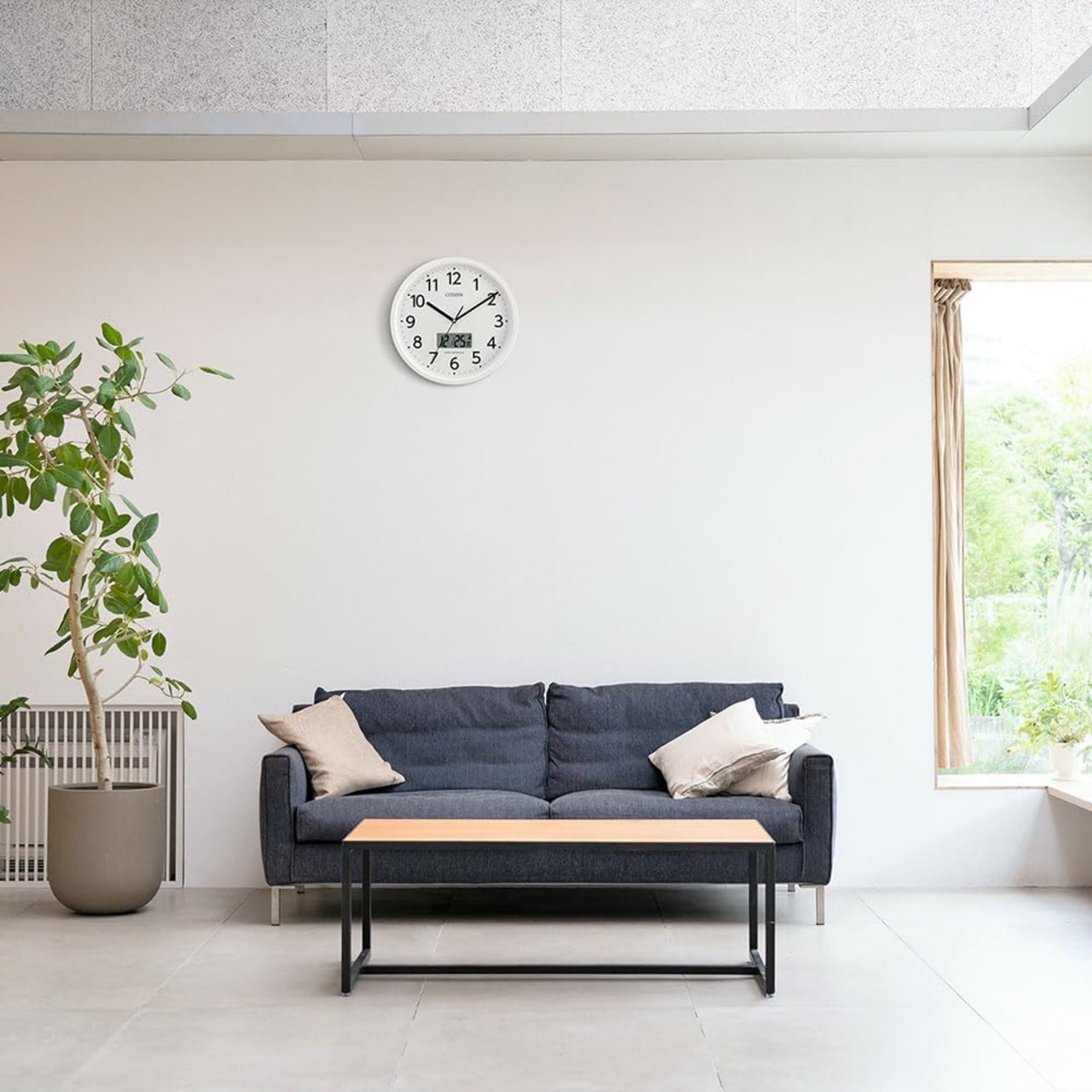 くらしに便利な温度・湿度計や、カレンダー表示付き。時刻が見やすいよう外枠を細身にし、文字板を広くデザイン。また、時字には視認性の高いユニバーサルデザインフォントを採用し、使いやすさを追求したベーシックな掛け時計です。