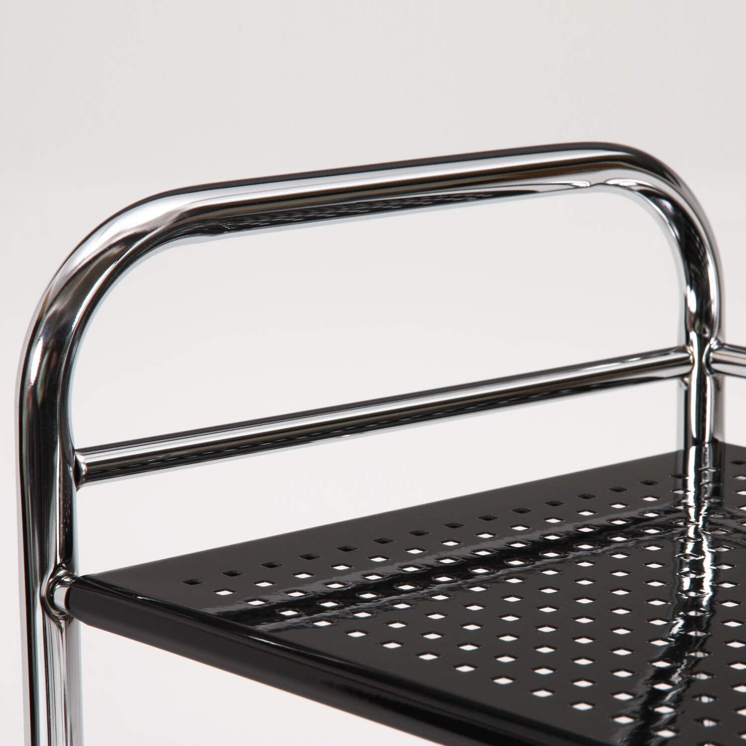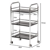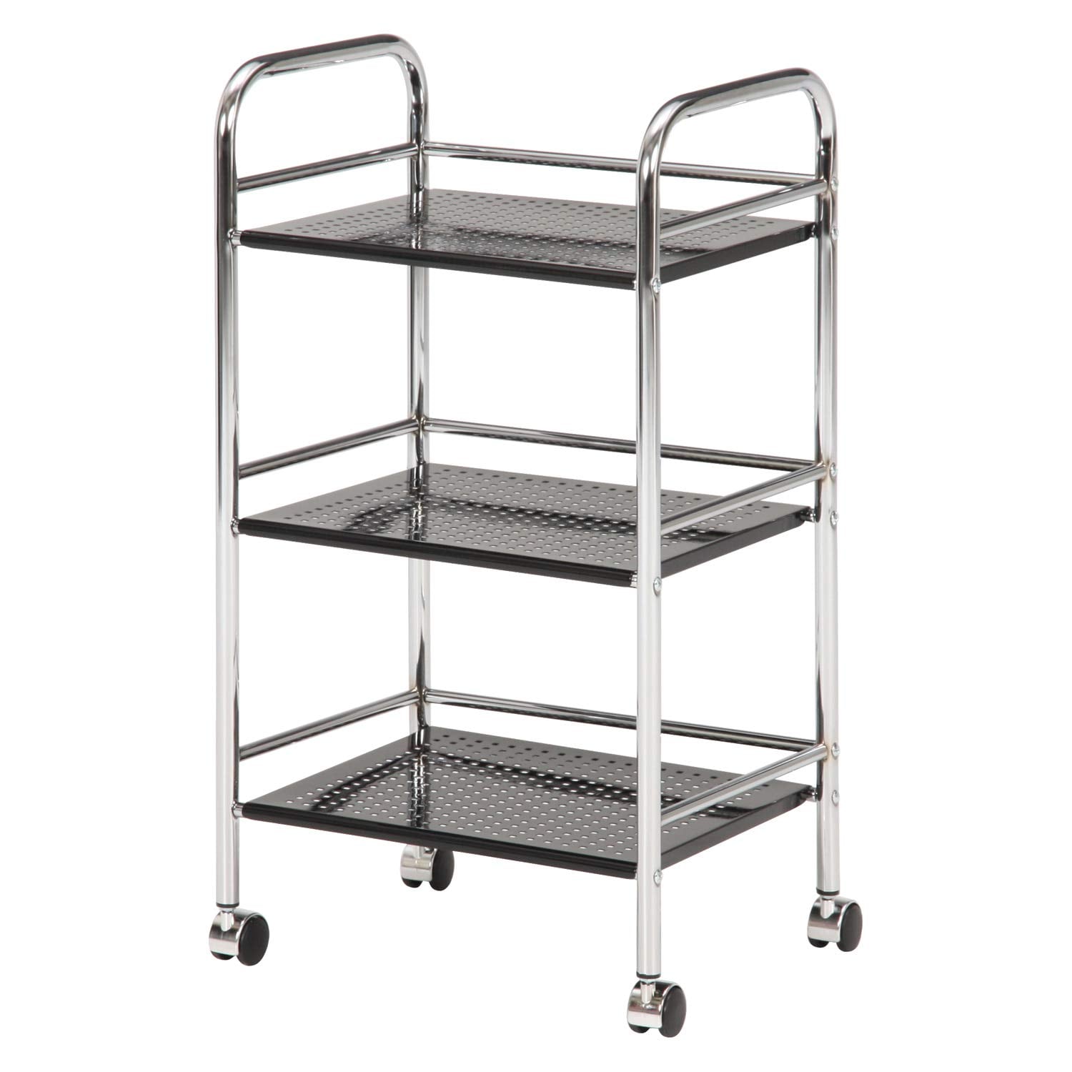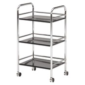 ●シンプルでマルチに使えるスタイリッシュワゴン●シルバーフレームで統一されたシンプルなデザインで、キッチン、洗面所、寝室などお好きな場所で活躍します。●幅36.5×奥行31cmの棚板が3枚あり、1枚の耐荷重が約5kg。●これ1台でたっぷり収納できます。●幅40×奥行32cmのコンパクトサイズなので、ちょっとしたスペースに収まります。●パンチング天板を使用しているので、熱もこもらず、家電製品などを置いても安心です。●棚板にはコの字型にサポートバーが付いており、落下防止として役に立ちます。●また、ちょっとした軽いものを引っかけておくのにも便利。●キャスター付きで移動がラクラク。●掃除もしやすく衛生的です。