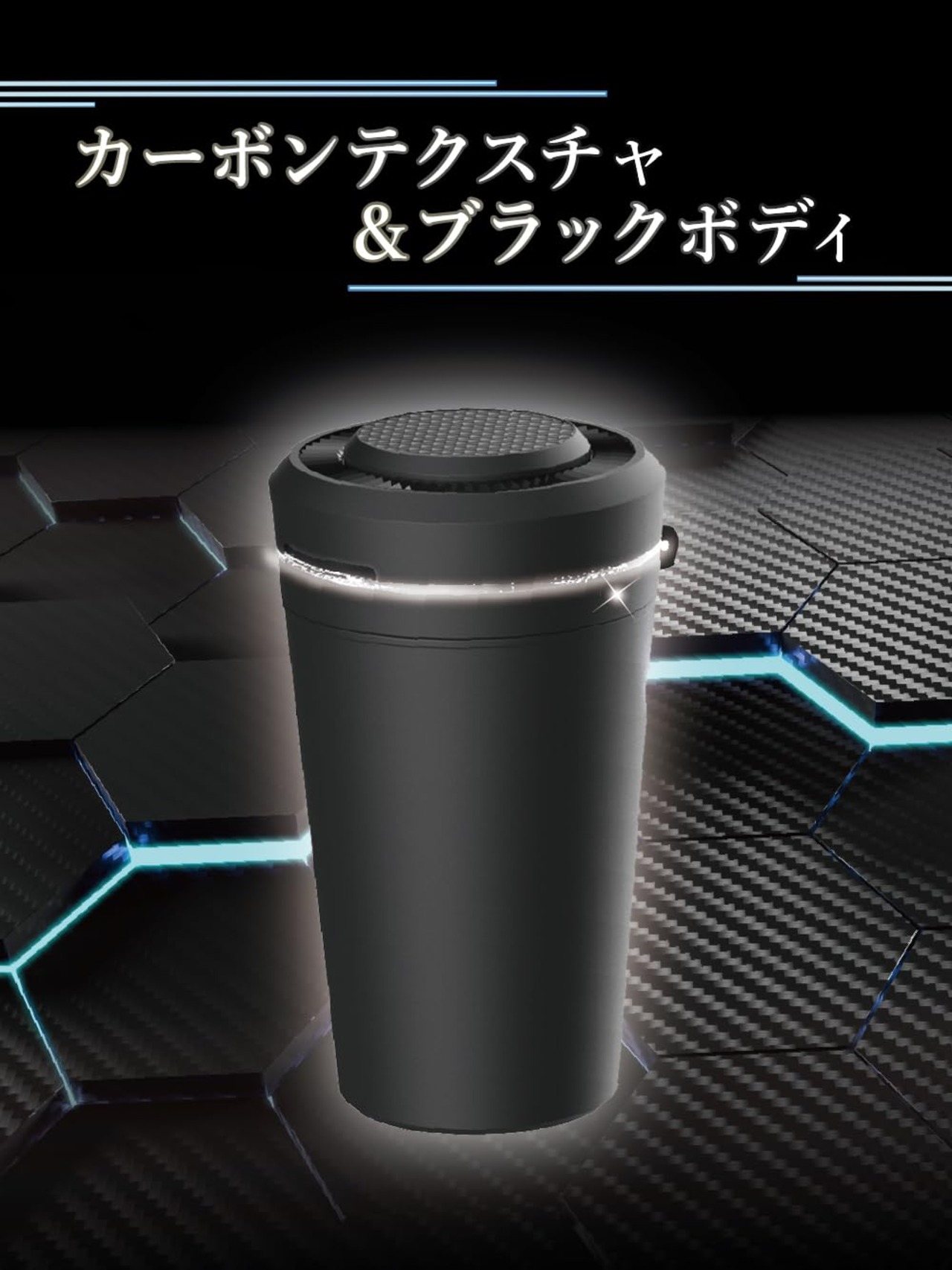 コイン電池よりも長持ちする単4形乾電池タイプの灰皿。ソーラー充電に適さない場所での使用に最適。カーボンテクスチャ&ブラックボディのスポーティデザイン。