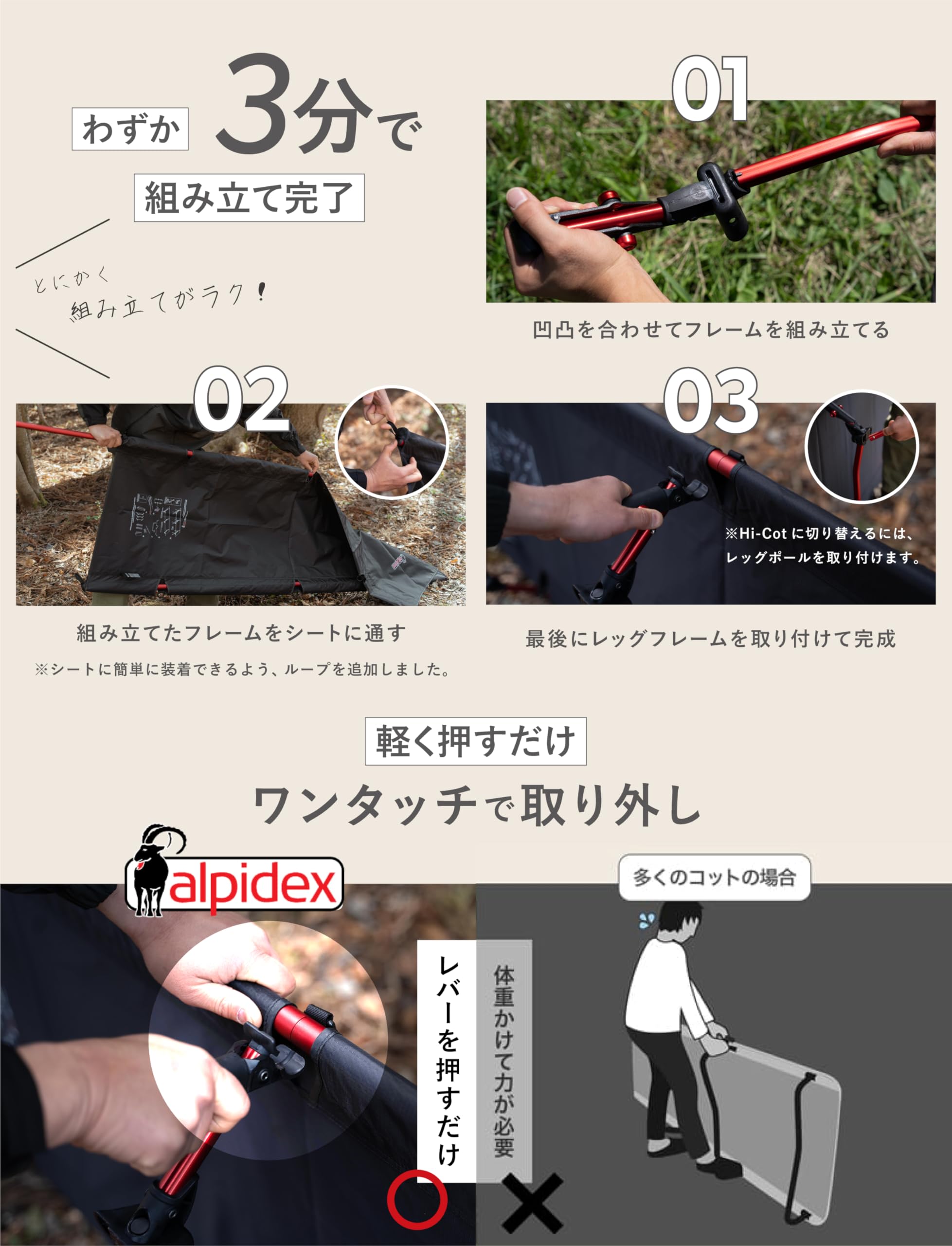 【 わ ず か 3 分 で 組 み 立 て 完 了 】レバーを押すだけワンタッチで組み立て出来る。体重をかけたり、力を入れる必要がないから、組み立ても 片付けもわずか3分で完了。 女性でもらくらく組み立てが出来ます。 【 ベ ッ ド の よ う な 寝 心 地 】独自構造により程よい弾力感、安定感のある寝心地を実現しました。縦のサイズも(約)190cmとゆとりがあるため、身長のある方でもゆったり寝られます。幅も67cmとゆったりしているため、フレームに腕が当たらず余裕をもって寝られます。 .