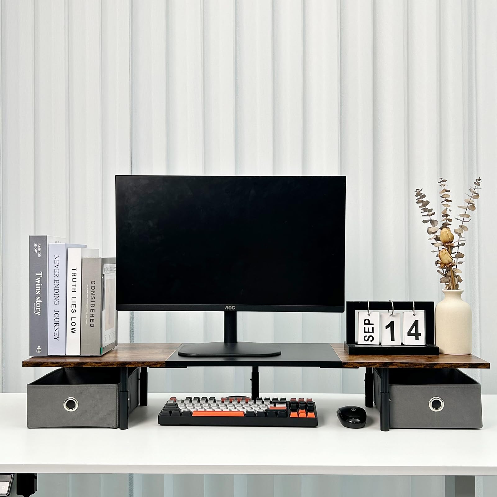 【多機能】モニター台だけでなく、本棚やプリンター台/fax台、テレビスタンドなどとしても便利です。多機能な机上台で、オフィスや研究室やリビングルームなどの場合もオススメです。画像や鉢植えなどお好きなものを飾れば、自分だけの癒し空間がつくれます。