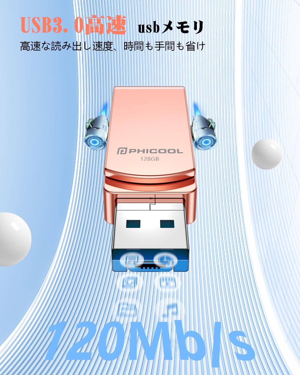 128GB USBメモリ [アプリ不要 アルバム直接保存!]4in1 Phone/Android/PC対応 phone から 直接 usb に 写真 を 移す/バックアップ可能 スマホデータ保存 外付けメモリ Type-C搭載 大容量外付けストレージ フラッシュメモリスマホ容量不足解消 高速 データバックアップ転送対応 ! (ピンク アプリ不要 128GB)