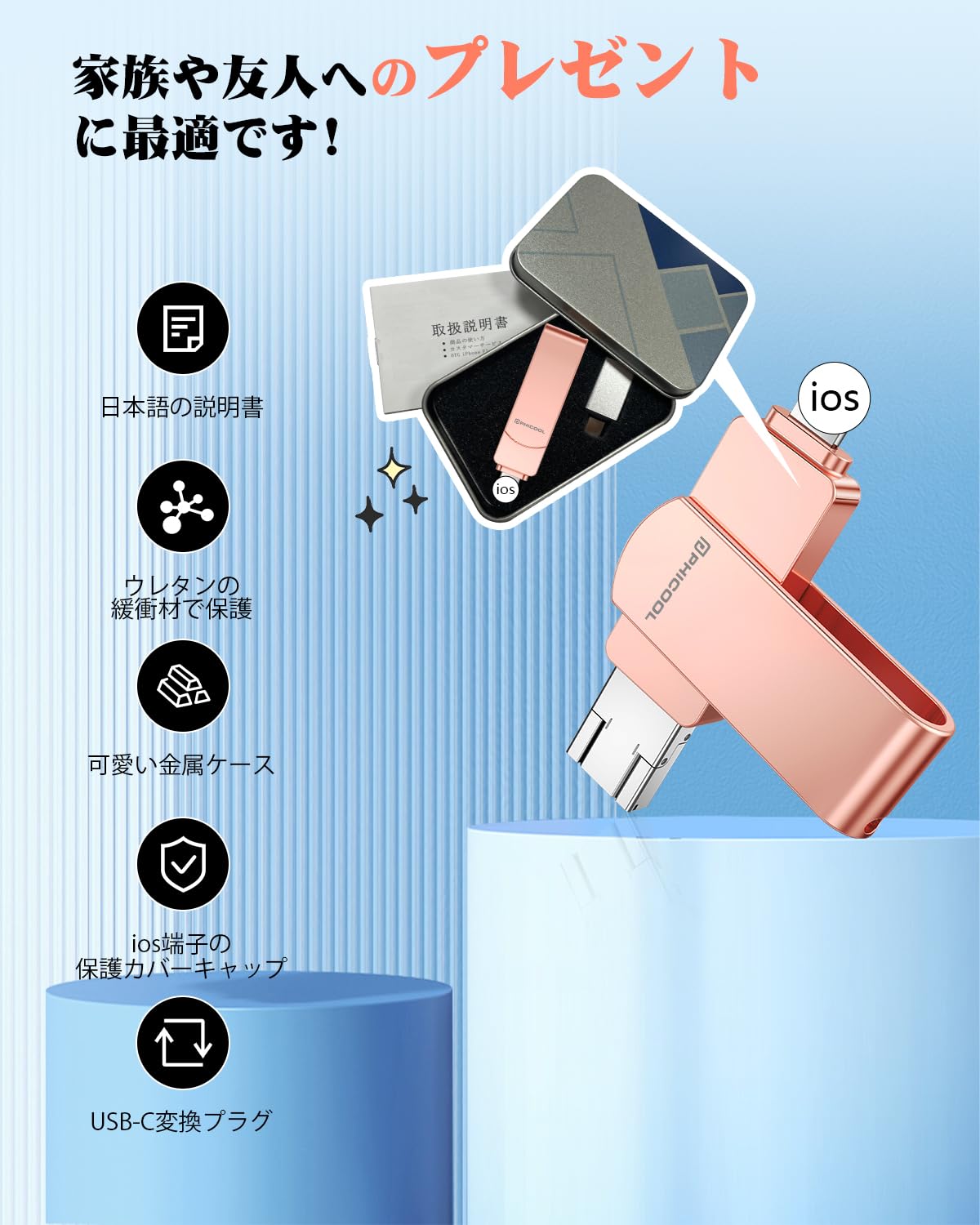 【数量限定】128GB USBメモリ [アプリ不要 アルバム直接保存!]4in1 Phone/Android/PC対応 phone から 直接 usb に 写真 を 移す/バックアップ可能 スマホデータ保存 外付けメモリ Type-C搭載 大容量外付けストレージ フラッシュメモリスマホ容量不足解消 高速 データバックアップ転送対応 ! (ピンク アプリ不要 128GB) | ニコニコSHOP