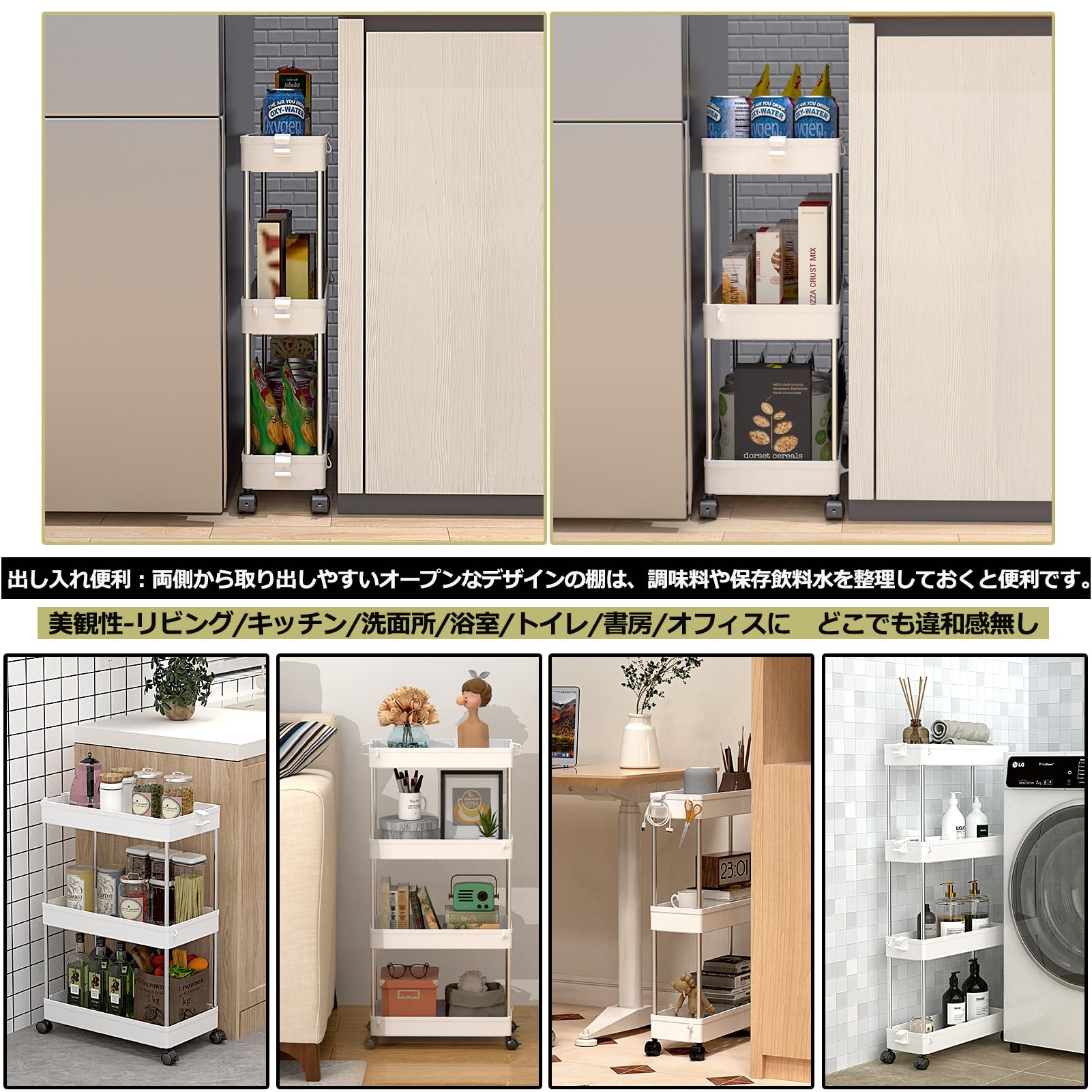 【高品質の家庭用収納 ワゴン】高級な材質は採用なので、高い安定性を誇ります。スリムボディーをして、部屋の隙間に自在に配置されています。トイレ収納、ベッドルーム、居間、子供部屋、キッチン、書店、美容室などの使用に最適して、収納力は抜群です。いろんなシーンで大活躍なキッチンワゴンです