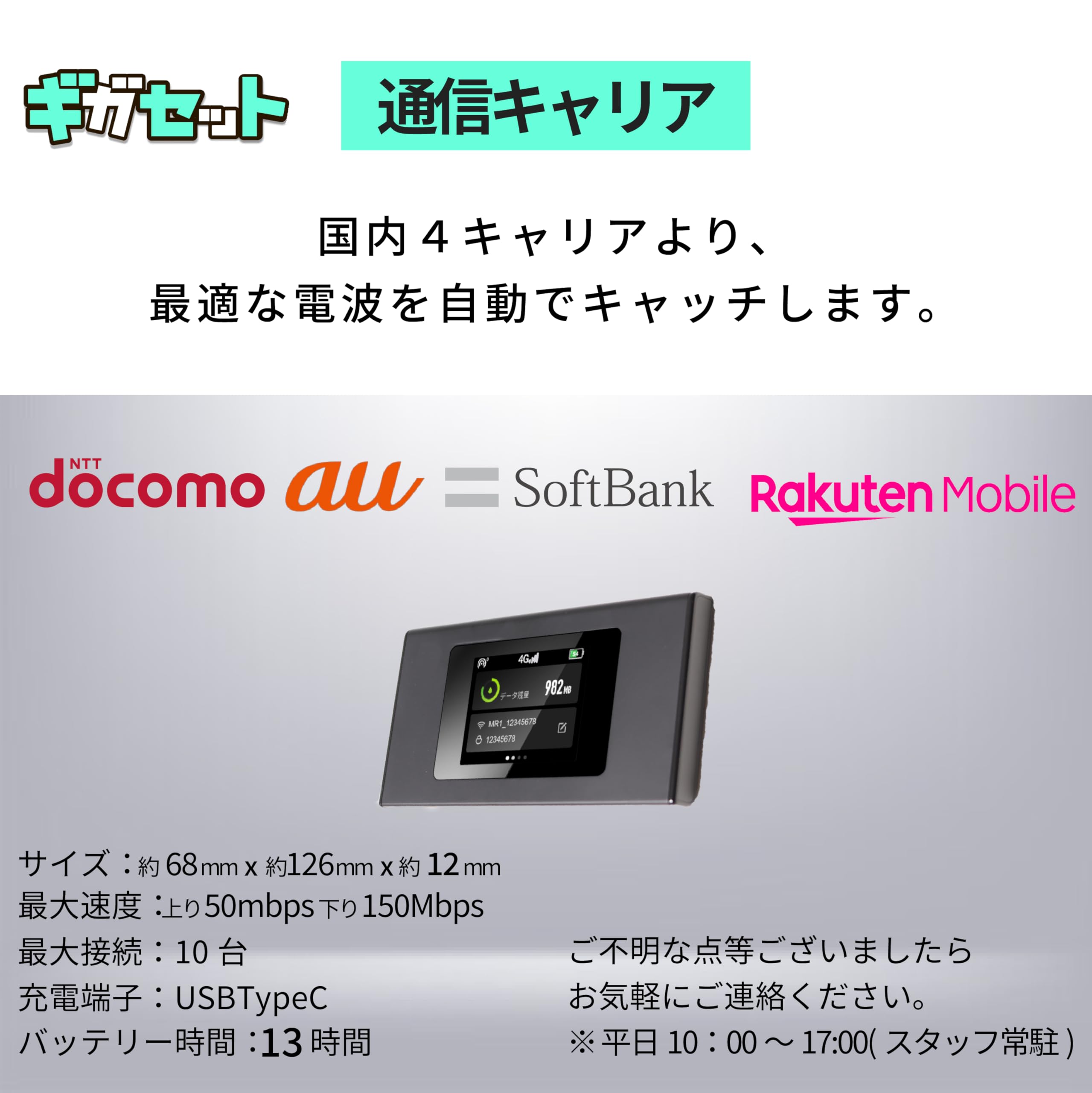 ギガ付きモバイルWi-Fiルーター 【返却・契約不要】買い切りWiFi。ギガは何時でもおかわりできる! 国内4G/LTE (通信回線は国内4大キャリア回線を利用) 海外利用も対応 バッテリー容量3000Ah 最大通信速度:上がり50mbps/下り150mbps