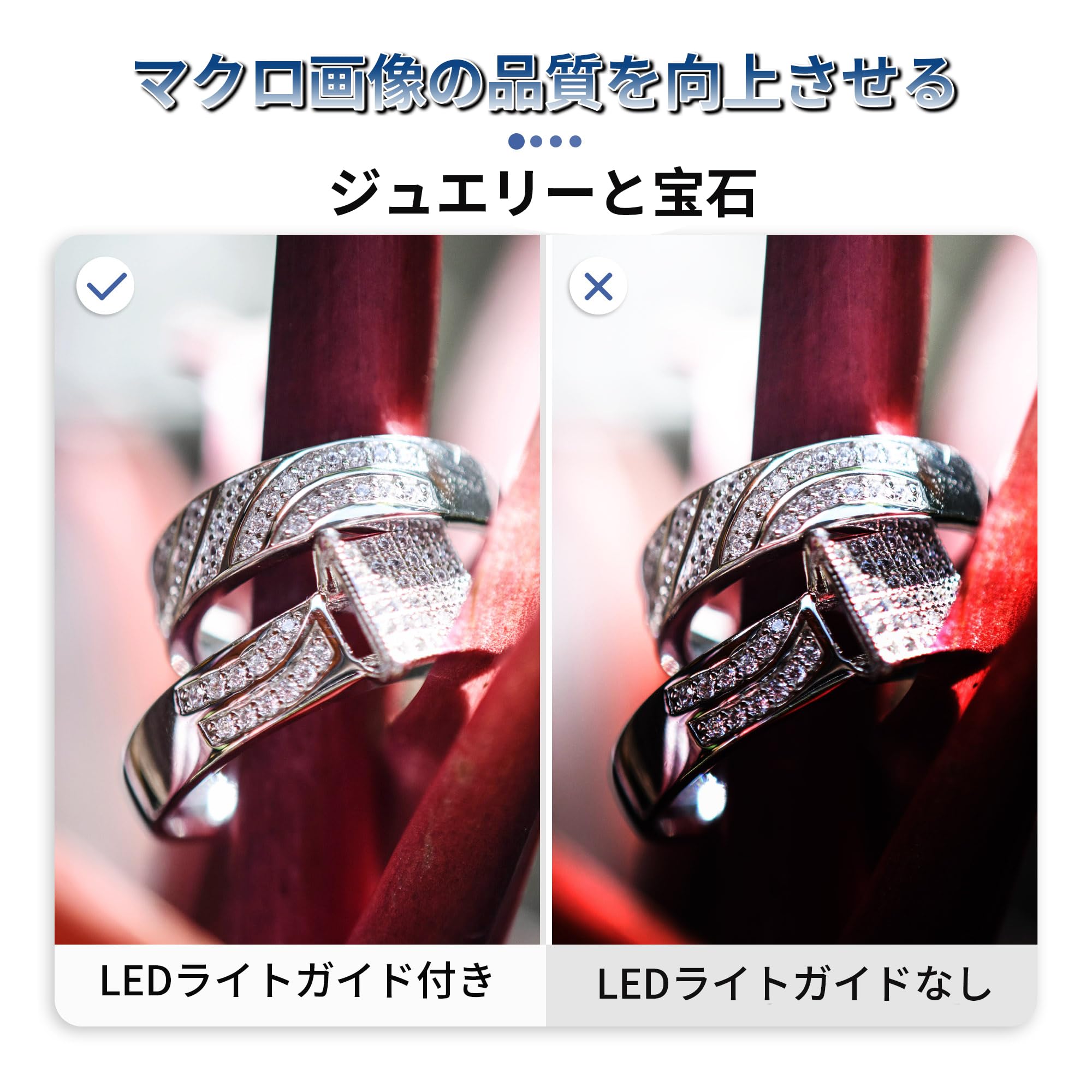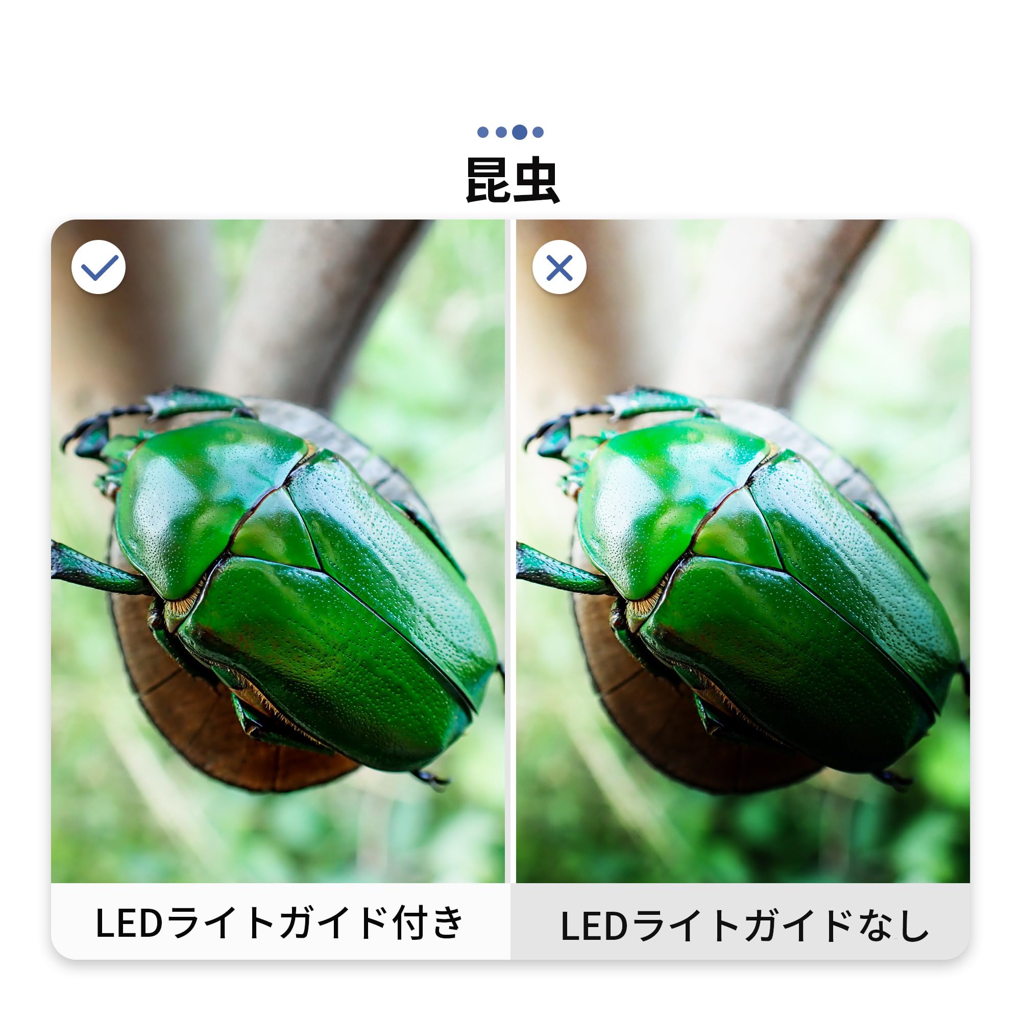 カメラレンズを装着し、LEDライトガイドで光を導くことで、ボディのLEDを光源として、より明るく照らすことができます。(※注:本製品はカメラ内蔵のLEDライト専用です。 ご使用の際は、必ずカメラの内蔵フラッシュをOFFにしてください。)
