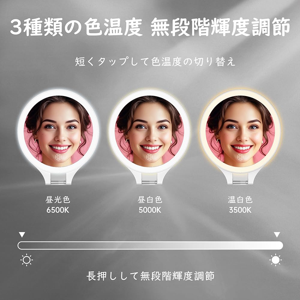 「3種類の色温度・無段階輝度調節」 昼白色・温白色・昼光色の3色に切り替えられるLEDライト付き鏡が内蔵され、ボタンを短くタップすれば色温度の切り替えができます。更に輝度の無段階調節ができ、ボタンを長くタップすればお好きな輝度まで調節可能です。様々な使用シーンを再現して、より完璧なメイクの仕上げに導きます。