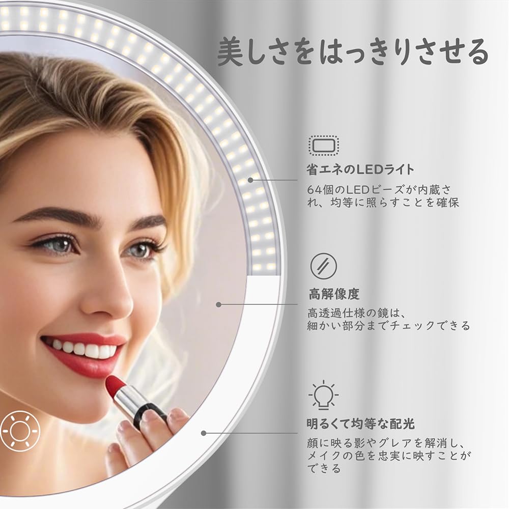 「LEDライト付き鏡」 鏡の周りは円型のLEDライトに囲まれ、顔を照らしながらメイクでき、顔に影ができにくく、顔の全体の仕上がりはもちろん、細部の化粧ムラまでしっかりチェックできて、メイクの完成度が1段階上がります。女優気分毎日気持ちよくお化粧の時間を楽しめます。