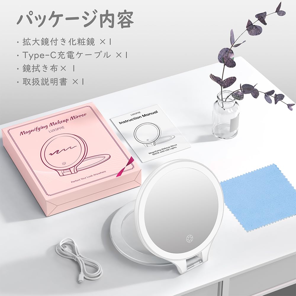 LEDライト付きミラー Luxspire LEDライト鏡 化粧鏡 手鏡タイプ 女優ミラー 折り畳み 卓上 壁掛け ハリウッドミラー メイク鏡 携行 省スペース 角度調節可能 拡大機能付き 3種類の色温度 輝度無段階調節 タッチ式 USB充電 10倍拡大 収納便利 日本語取扱説明書 ホワイト