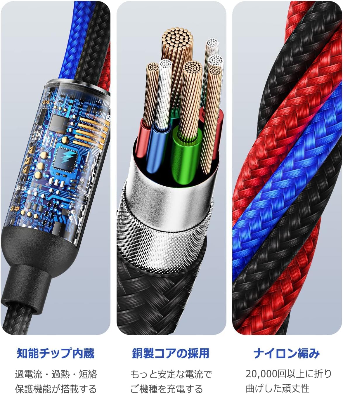 【▶優れた耐久性】この3イン1 USBケーブルでは、高耐久性の素材を採用し、一般的なケーブルより5倍以上の持続力を持ち、折り曲げに対しても圧倒的な耐久性を実現しました。また、安全性と信頼性の向上のため、56Kオームのプルアップレジスターを採用しました。