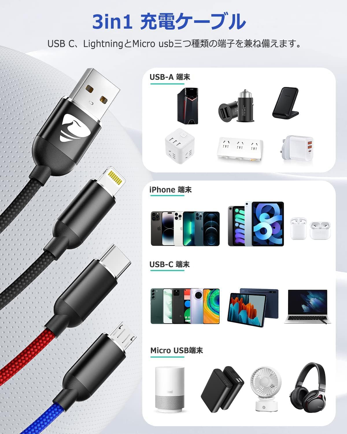 【数量限定】Aioneus 3in1 充電コード 2本セットiPhone充電器ケーブル USB Type Cケーブル Micro USBケーブル iPhone 14 13 12 Pro Max Mini 11 8 7 6 Galaxy S20 S10 S9 S8 S7 Xperia Android Pixel 5 4 3 | ニコニコSHOP