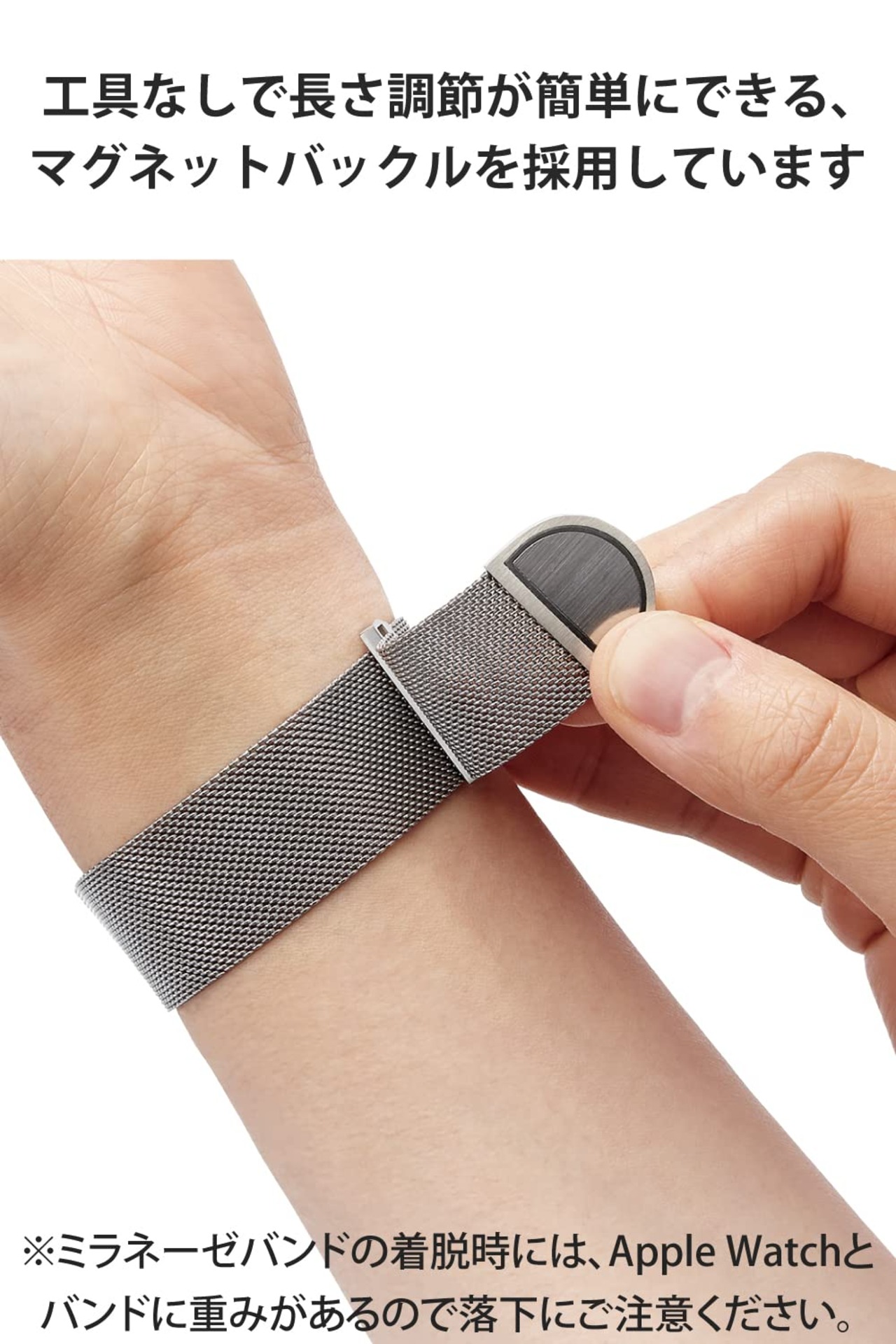 ■バンドをApple Watchに装着したままで液晶画面の確認、本体の操作、各種ボタン操作、純正の磁気充電ケーブルへの設置が可能です。 ※ミラネーゼバンドの着脱時には、Apple Watchとバンドに重みがあるので落下にご注意ください。