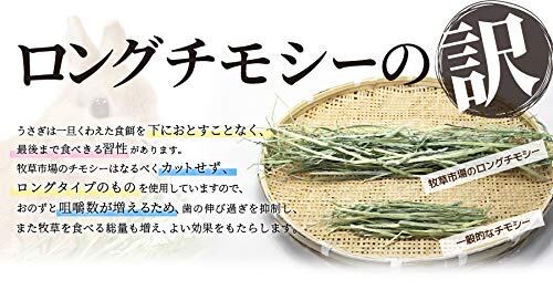 ■歯の健康維持:一般的なチモシーと比べてロングタイプのため咀嚼数が増えます。その結果適度に歯が摩耗し、不正咬合からうさぎ達を守るのに役立ちます。