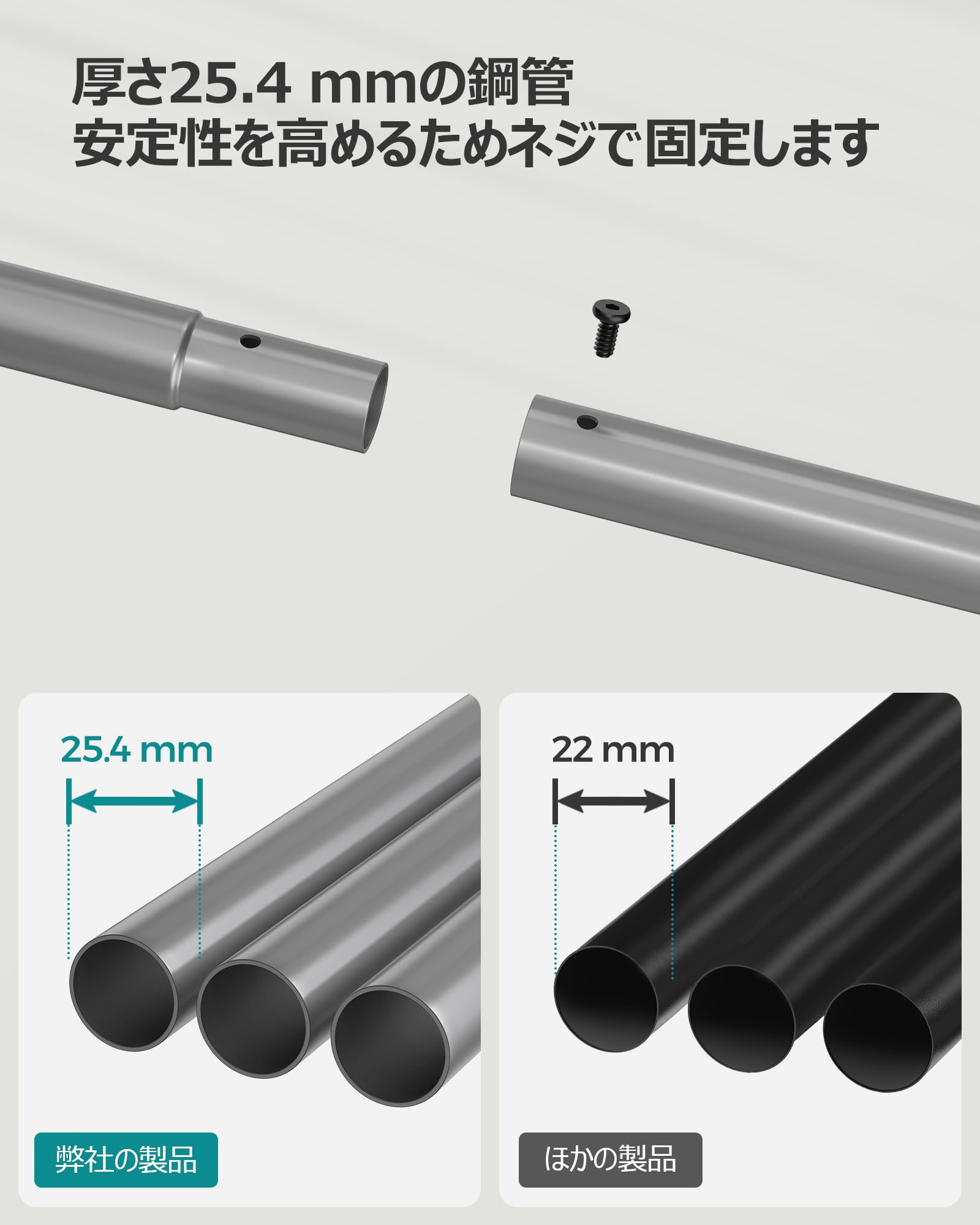 【安定性良い】:頑丈なスチール製のハンガーラックなので、強度は強くて、しっかり安定しています。重めのコート等を掛けても安心です。足元はネジで接続されていますが、通常の差し込み式より変形しにくく、長い年月のご使用に耐えられます