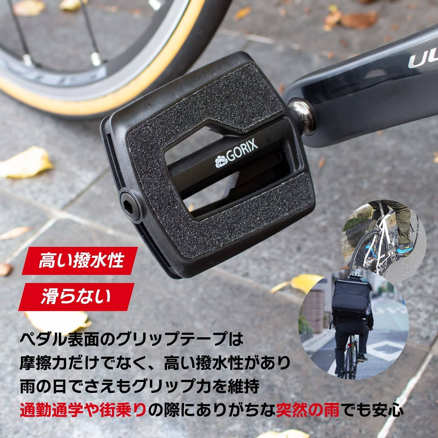 [滑らない]ペダル表面のグリップテープは摩擦力が高いだけでなく、高い撥水性を有しています。雨の日でさえもグリップ力を維持。通勤通学や街乗りの際にありがちな突然の雨でも安心。