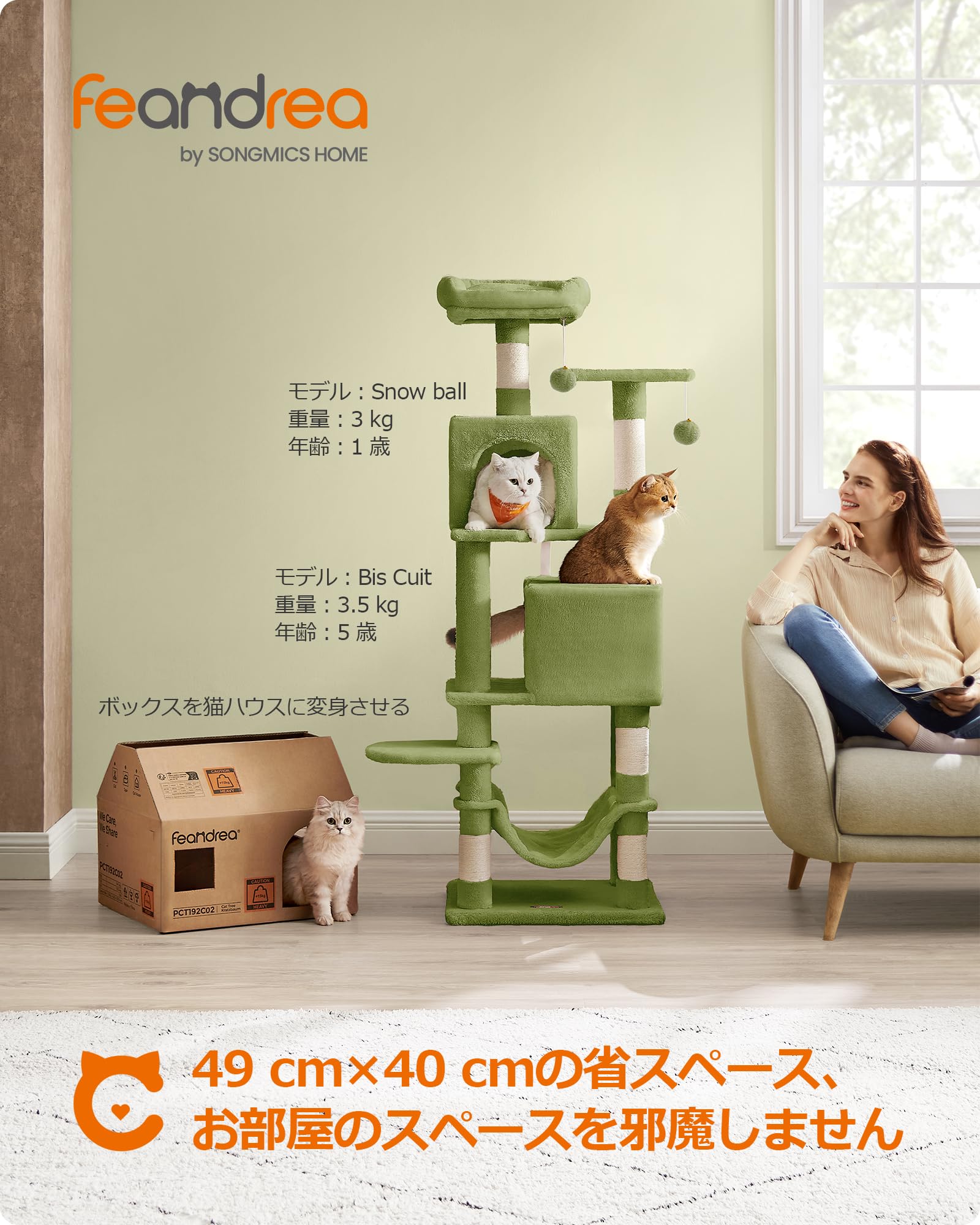 FEANDREA キャットタワー 猫タワー スリム 人気 大型猫 多頭飼い 据え置き 省スペース ハンモック付き 爪とぎ 運動不足解消 おしゃれ 高さ155CM グリーン PCT192C02