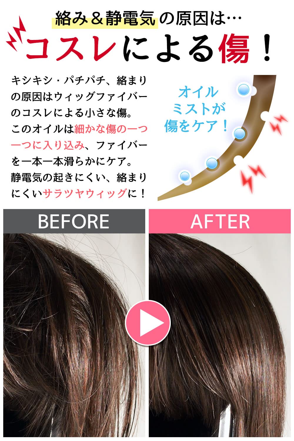 【ウィッグ工場から生まれたウィッグのためのオイル】 ドラッグストアや量販店で販売されている市販ヘアオイルの大半は、ポンプ式です。 そのため、ウィッグに使用するには使いづらいというデメリットがあります。 MilicaBooksウィッグオイルは、細かいミスト状のオイルだからウィッグのケアに最適です。 ウィッグ工場から生まれたウィッグのためのヘアケアオイルです。