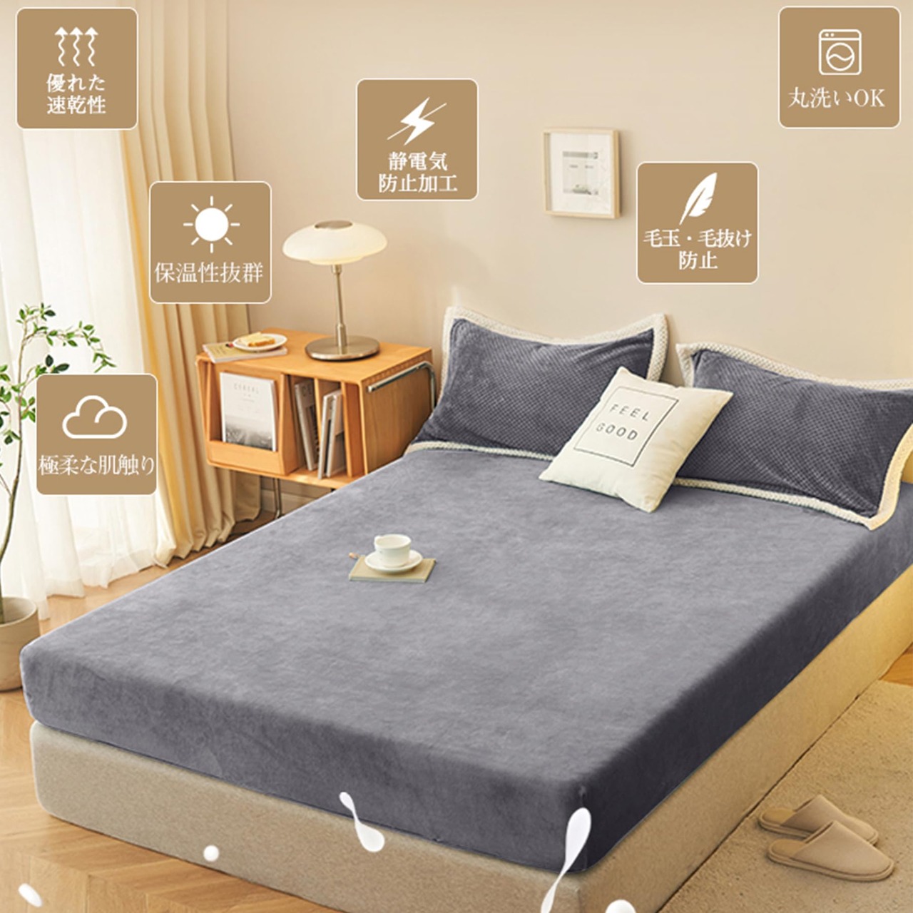 【ふんわり包まれるシーツ】上質なミルクベルベットのような優しい肌触りで、滑らかでふわふわ、心地よく眠れます。 手をなぞるうちに生地の質感が変化し、何度も触ってしまいます。 ベッドに入った瞬間にため息が出るほどの寝心地です! 肌を気にせず安心して眠れます。 敏感肌の方や赤ちゃんにも安心・快適!&【静電気防止加工】静電気防止加工を施しているためです。 パチパチと不快な静電気が起こらず、静電気によるストレスが解消されます。