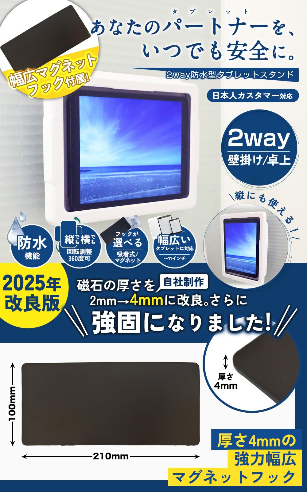 【壁掛けでも卓上でも!2way式防水型タブレットケース】 壁掛けでも卓上でも2つの機能を実現。壁掛けの際はマグネットが使用できるところであれば、マグネットで、マグネットが使用できないところは強力貼り付けフックがあるので、基本的にどこでも壁掛け可能です。
