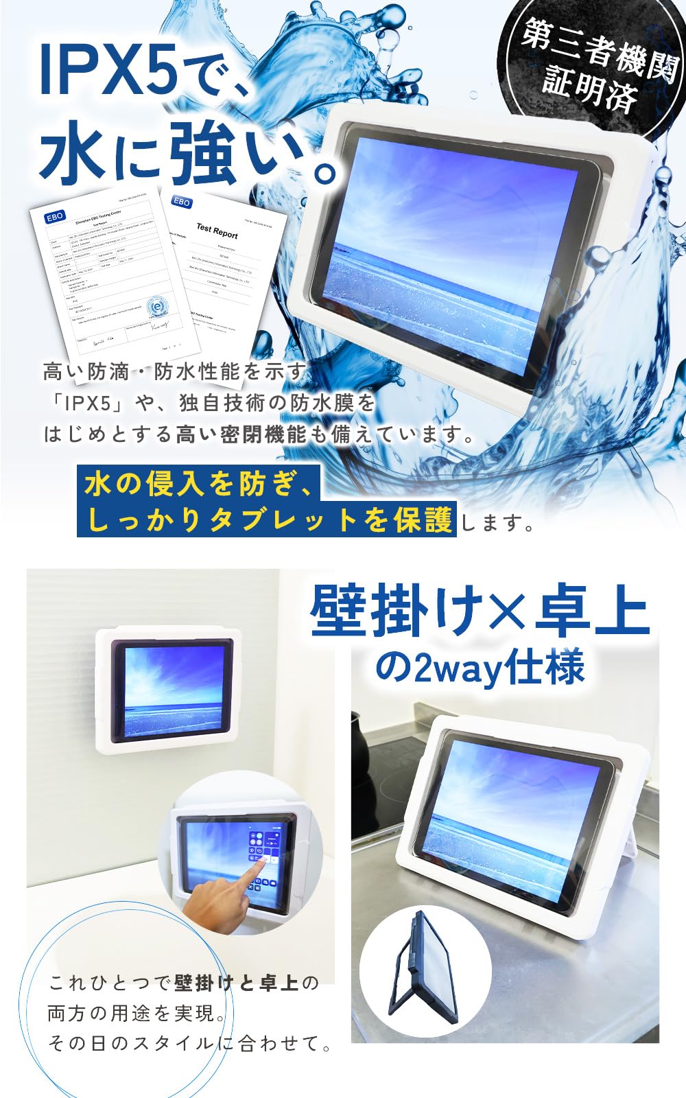 【IPX5防水機能により大切なタブレットを守る】シャワーでかけても、防水で濡れることがなく、手に水や泡がついていても操作可能です。またロックスイッチがついているので勝手に開くこともありません。第三者機関によりIPX5の防水機能が備わっていることが証明されております。