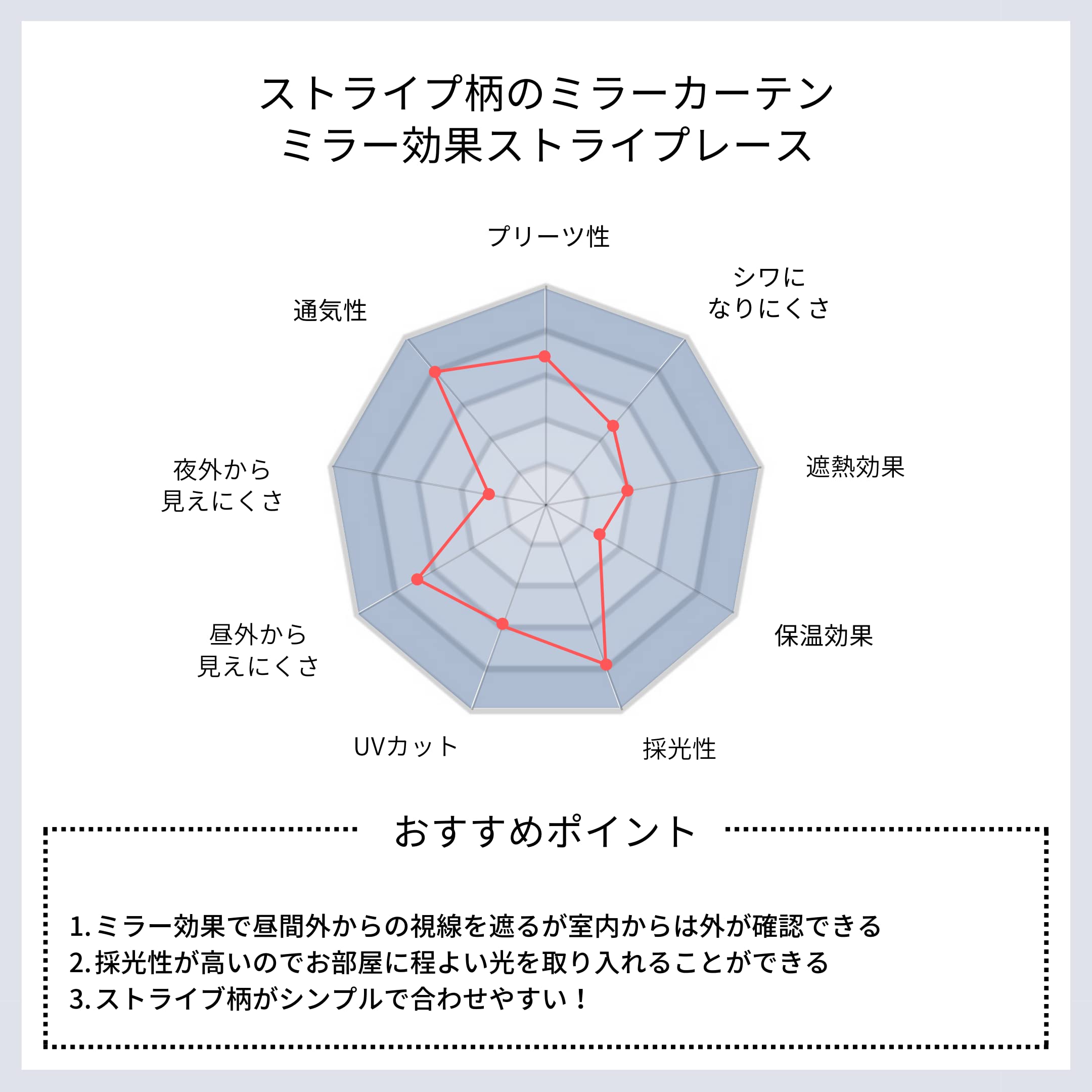 生地の裏面に光沢糸を使うことで、昼間はレースカーテンだけでも外から見えにくい一方で、室内からは景色がある程度見えるように仕上げています。夜間などお部屋が外よりも明るくなる場合にはお部屋の中が見えやすくなりますが、厚地カーテンを閉める方にはデメリットになりません。