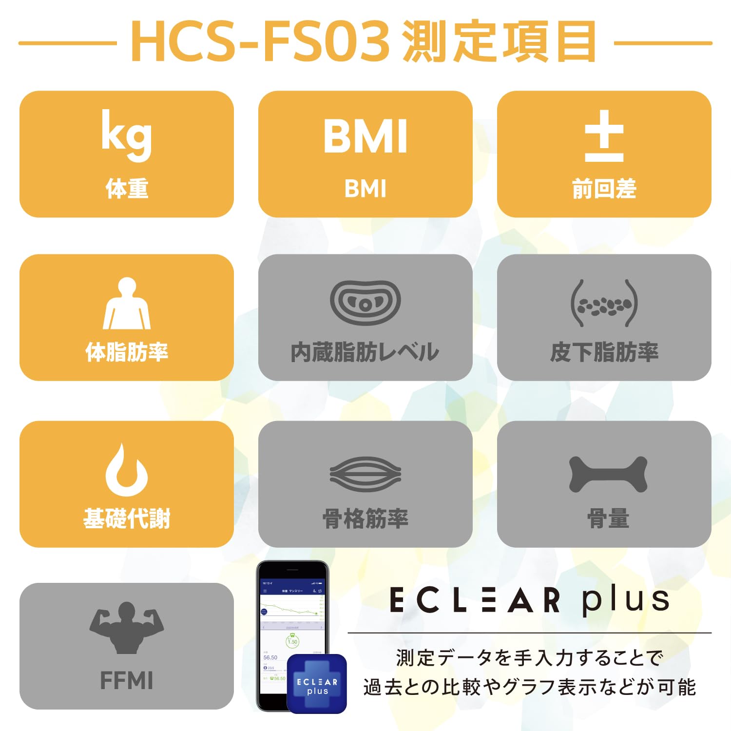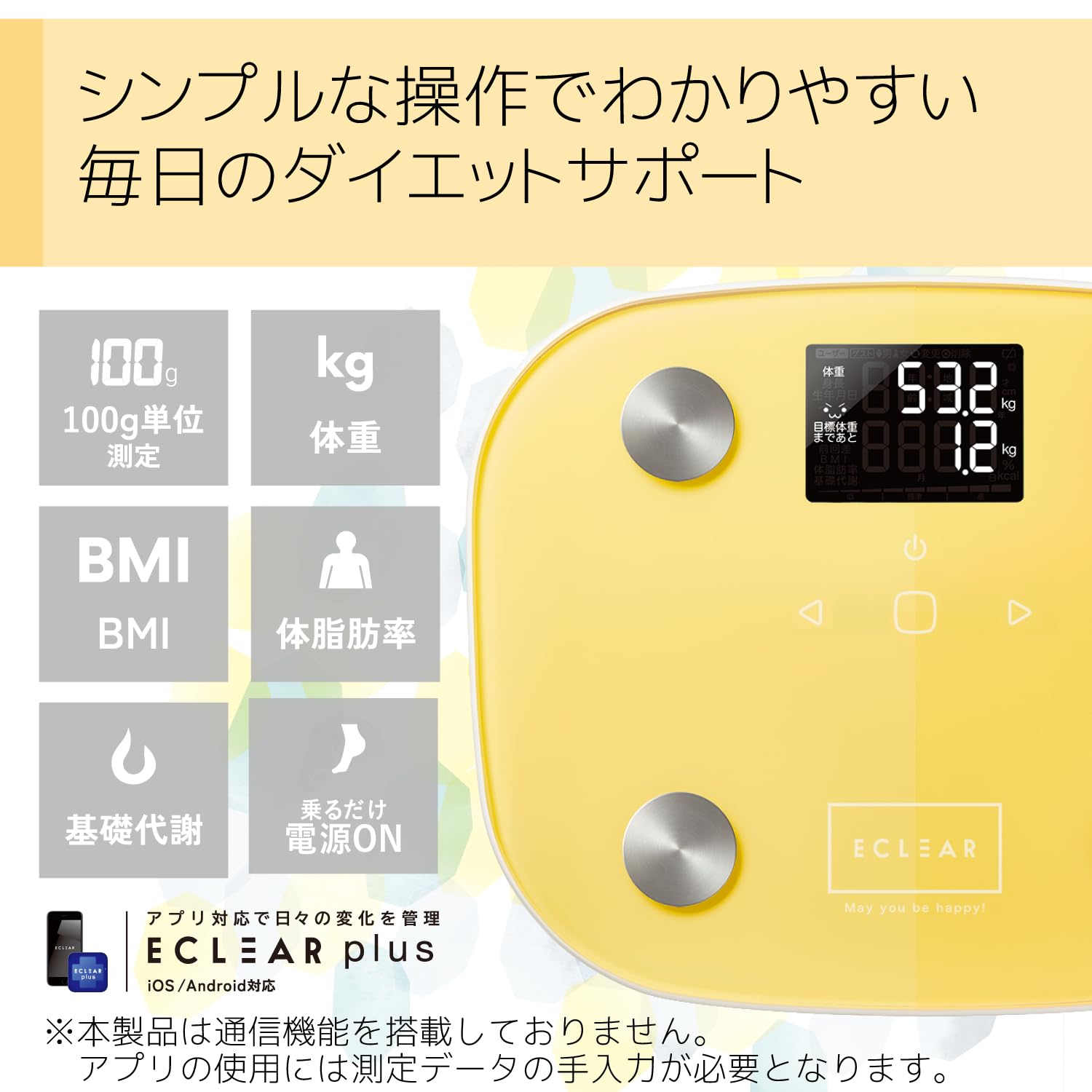 ●目標体重設定機能と顔文字表示で毎日の変化が見える"ECLEAR 体組成計"。●目標体重と現在の体重の差を表示する"目標体重設定機能"によって、目標との差が一目でわかり、モチベーション維持に最適です。●目標体重に対する成果がわかりやすい"顔文字表示機能"搭載。●目標体重に近づくとアイコンが笑顔になるなど、表情で一目でわかります。●体重・BMI・体脂肪率・基礎代謝の4項目が測定可能です。●筑波大学と共同研究した独自のMRI測定方式により、より正確な体脂肪率の測定が可能です。●乗るだけで過去の測定データから個人を推定する"自動認識機能"を搭載。●電源を入れるなどの手間がかからず、すばやく簡単に測定できます。●暗い場所でも表示が見やすい"バックライト"を搭載しています。●厚さ約18mmのコンパクト設計で収納にも場所を取りません。●専用アプリECLEAR plusに体重・体脂肪率を手入力すると、BMI、内臓脂肪レベル、骨量、骨格筋率、基礎代謝を確認できます。●体重、体脂肪率、骨格筋率はグラフで表示できるため、日々の変化を分かりやすく記録できます。