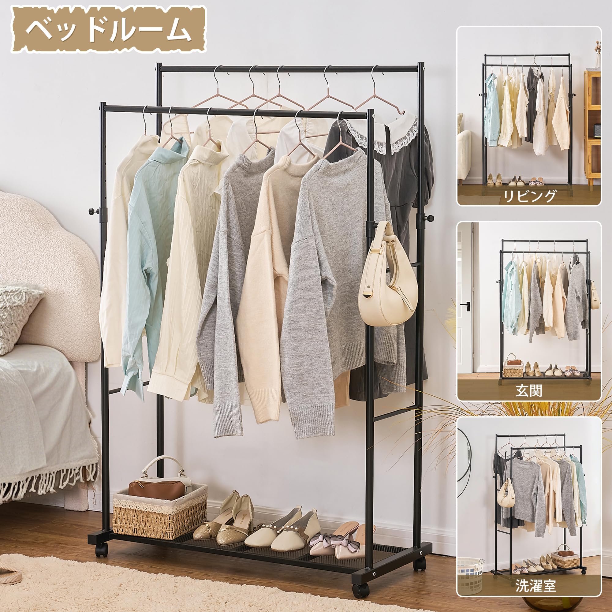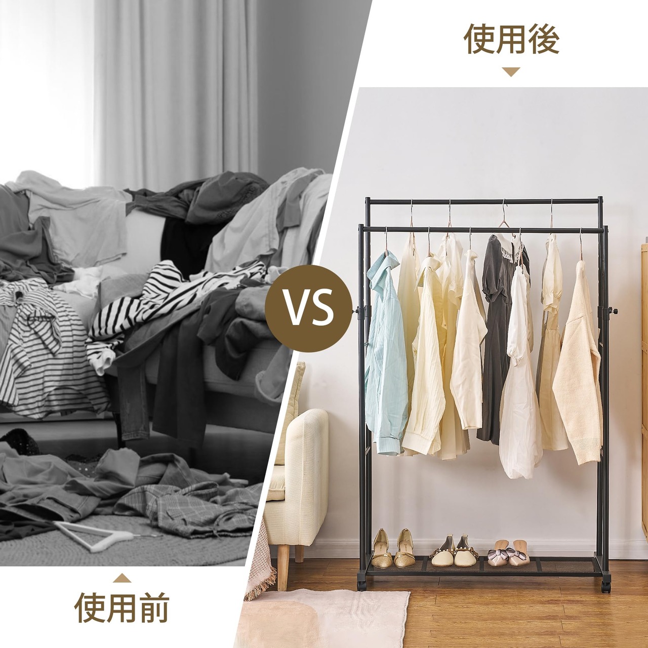 【耐荷重に優れた頑丈設計】このハンガーラックは耐久性が高く、重たいコートやスーツなども安心してかけられます。このハンガーラックの頑丈なフレームが長期間の使用にも対応し、日常使いに最適です。サビに強い仕上げが施されているため、長く清潔にお使いいただけます。