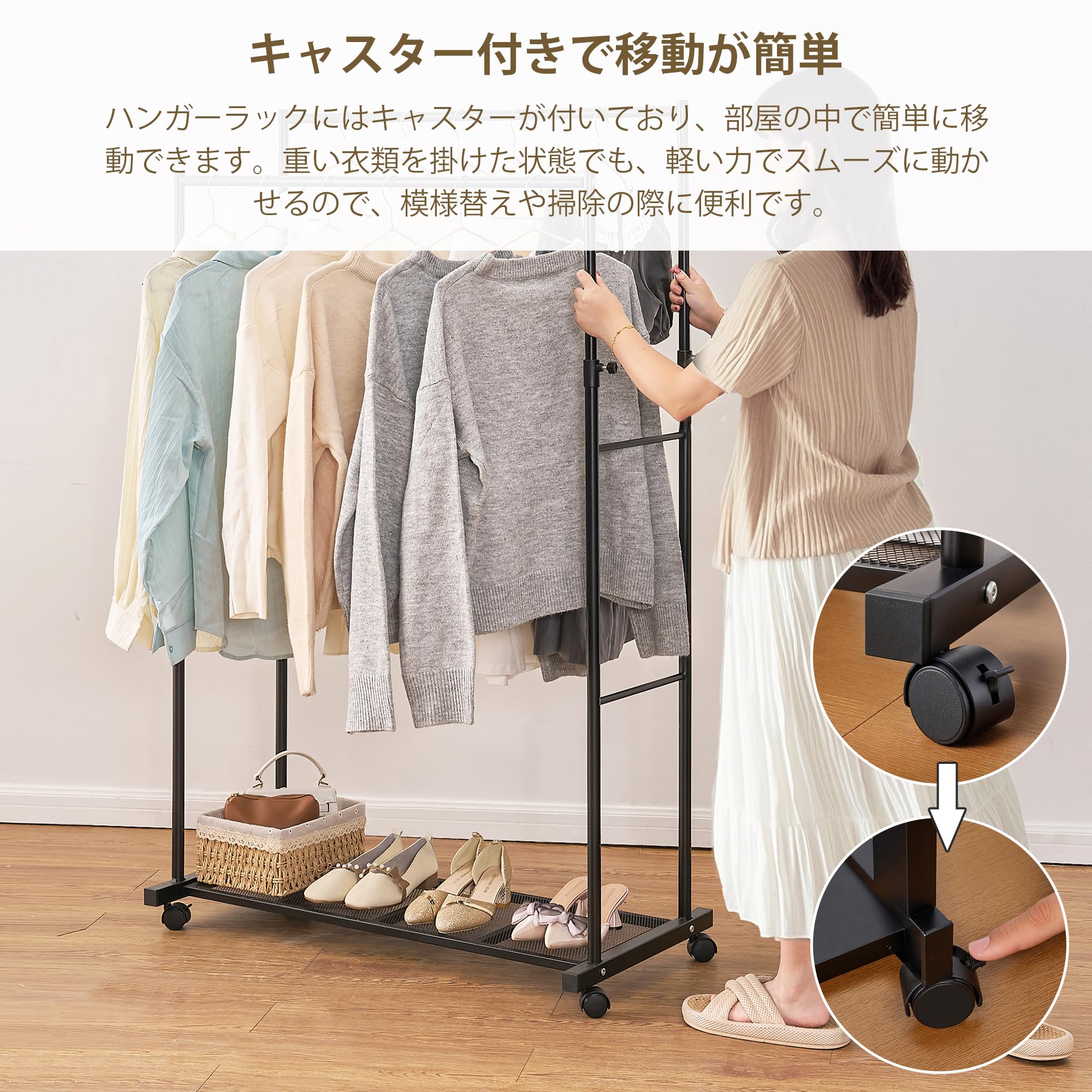 【キャスター付きで簡単に移動可能】本社のハンガーラックはキャスターが付いているので、洋服をかけたまま簡単に移動でき、掃除や模様替えの際も手間がかかりません。ハンガーラックのキャスターにはロック機能もついているので、安定して使用できます。