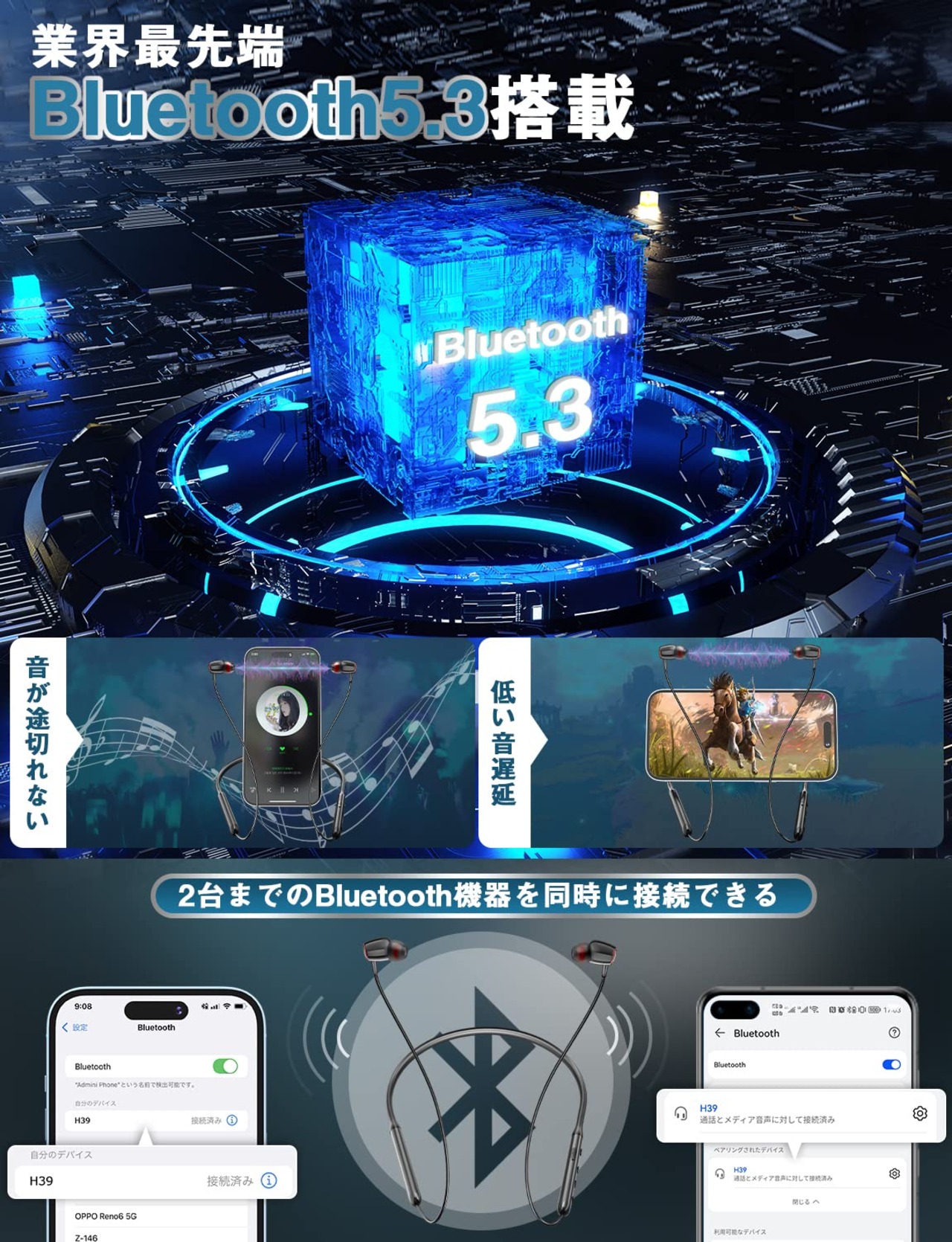 ◆史上最も長い・38時間連続再生ネックバンド型イヤホン登場◆ 【最先端bluetooth5.3チップ・大容量バッテリー】️最先端のBluetooth5.3技術を採用されて、接続性がよく安定して、通信スピード、通信範囲とも向上にしました。従来品と比べると高速で移動する際にも、遠距離の空間にも、従来品より「音飛び」や「音切れ」」などの状況も改善できます。省エネルギーの大容量バッテリーがダブル搭載されているため、1回のフル充電で最大約38時間連続再生できて、普通のbluetoothイヤホンより2倍以上実現します。USB Type-C充電が採用されているため、急速充電にも実現可能。わずか10分間充電すると、2時間の程度使える状態になります!通学、ランニング、旅行、出張など長時間の移動が多い方にはおすすめです。WEB会議/テレワーク/通勤通学/運動等の際にも安心してご使用いただけます。(ご注意:再生時間は充電時間、音量調整、再生内容、使用環境、個人使用習慣、接続デバイスなどによって異なる場合があります。)