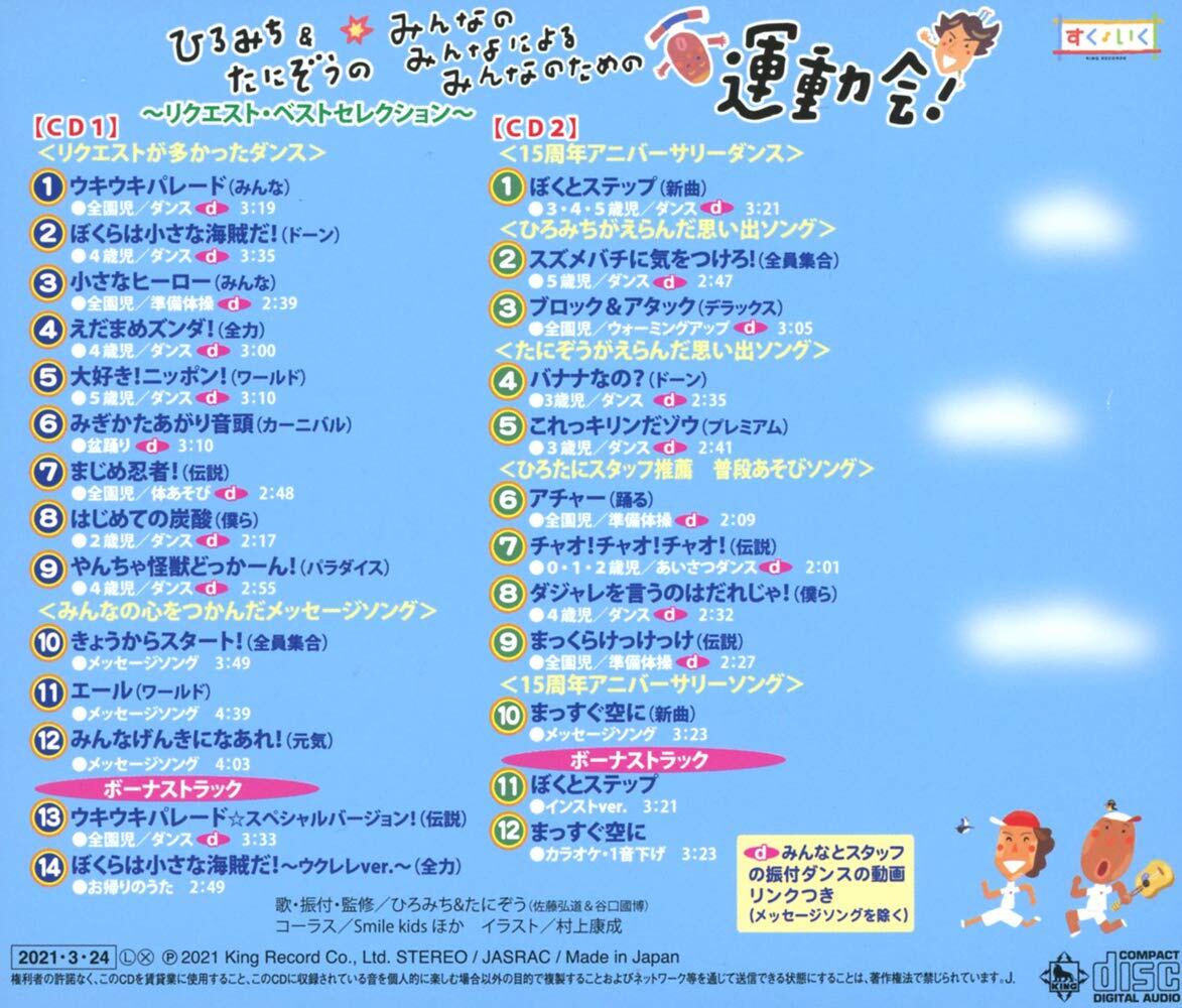 大人気ひろみち&たにぞうの運動会シリーズ!記念すべき第15弾はアニバーサリーな2枚組!ひろみち&たにぞうの運動会の人気ダンス&ソングがベスト盤に!ぜんぜん2枚じゃおさまらないけど、ギュ~と圧縮!みんなと、ひろみち&たにぞうが選んだベストセレクション! (C)RS