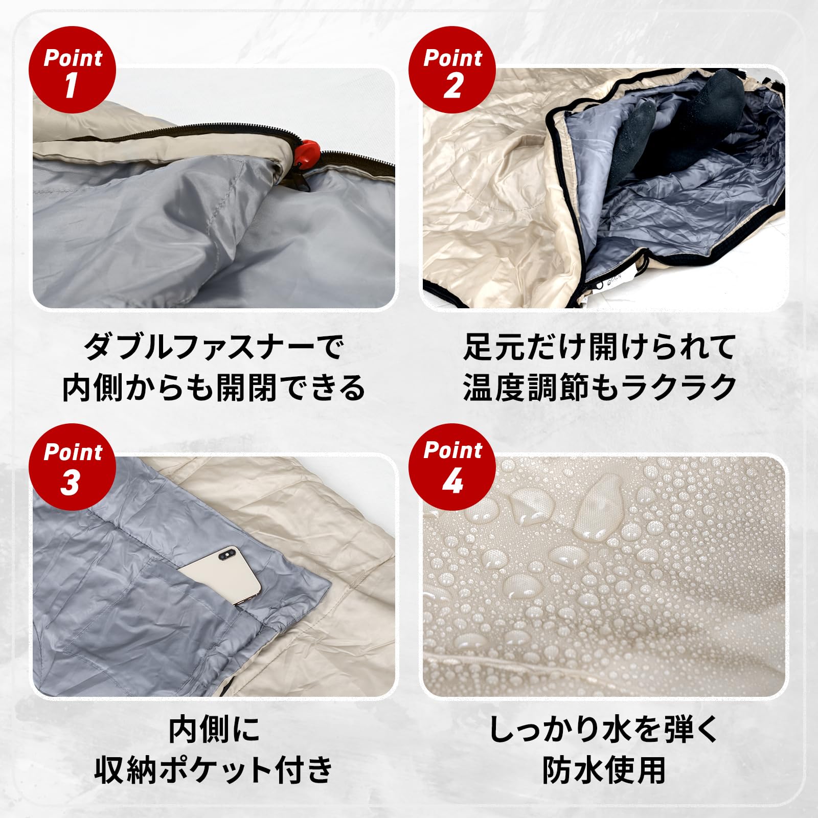 シュラフの内側からも外側からも開閉が出来るダブルファスナー仕様なので、出入りが簡単。足元だけを開けることも出来るので温度調整も可能。