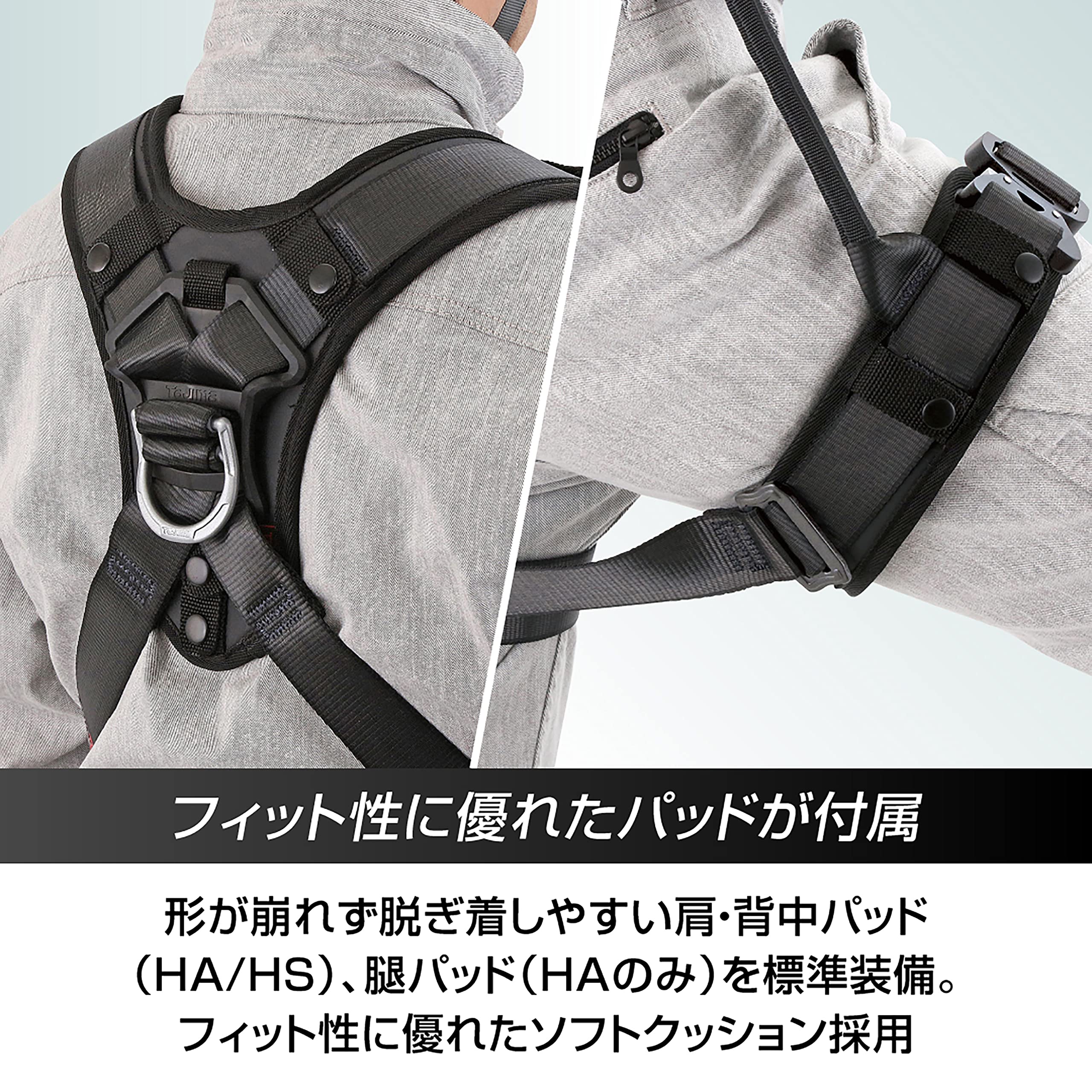 ●快適性と装着性、軽さにとことんこだわったハイスペックモデル●腰道具を付けたまま脱ぎ着ができます。ハーネスを使う時に胴ベルトを外す必要がありません。●軽量で操作性抜群のアルミワンタッチバックル仕様です。●形が崩れず脱ぎ着しやすい肩・背中パッド/腿パッドを標準装備です。●スマートパス構造:腰道具の上を通るベルトが細幅仕様になっているので、腰道具の隙間にベルトを逃がすことができます。●フィット性に優れたソフトクッション採用です。