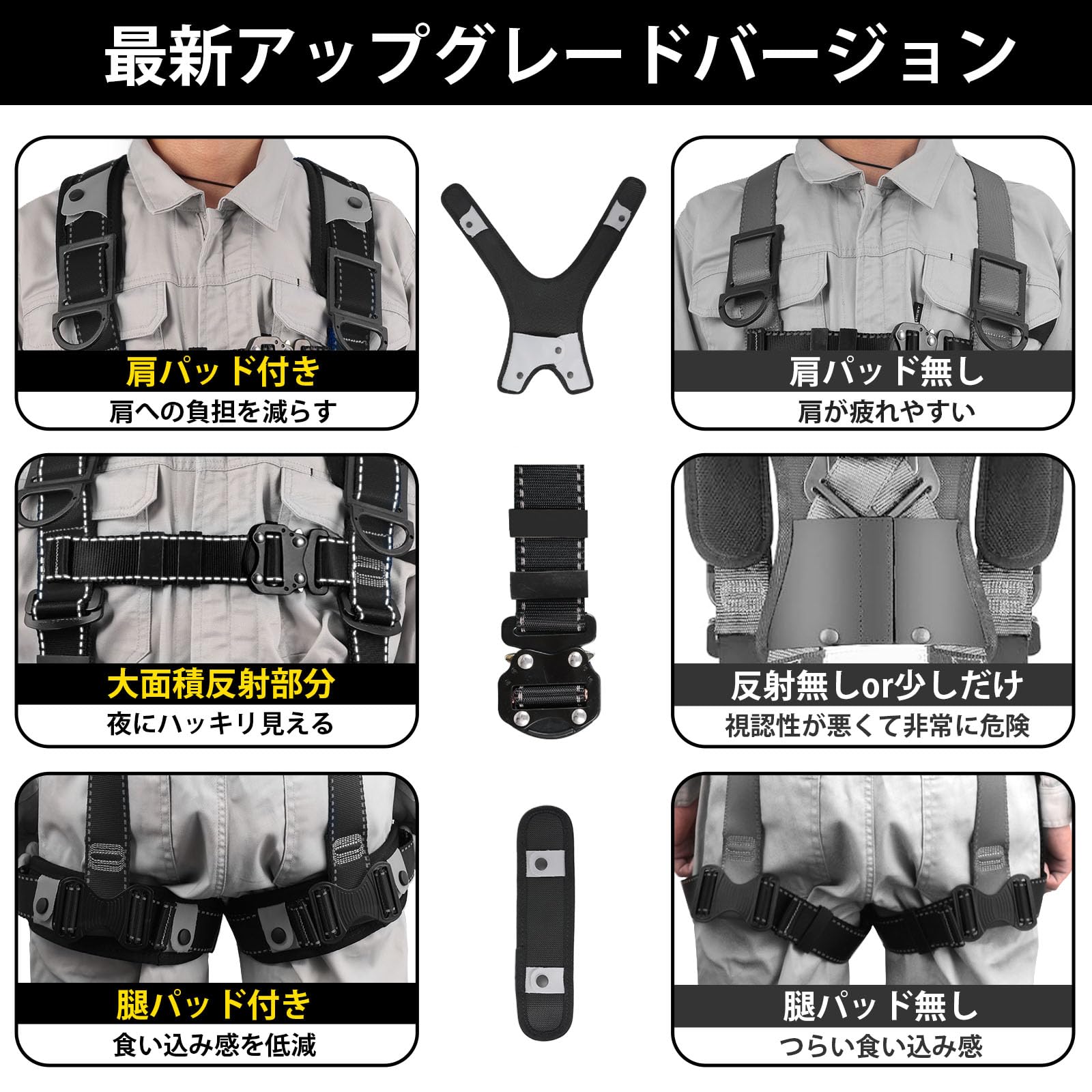 【脱着便利快適】:X型肩パッド付きで肩への負担を軽減して長時間着用するのに不便ではありません。パッドは通気性良くて蒸れにくいメッシュ素材を採用し、効果的に肩への荷重をX形に沿って背中に分散します。腿ベルトも同様にパッドを取り付けていて、着用するときの締め付け感を低減し、快適な着用感を実現しました。また、ハーネス安全帯はすべてワンタッチ式のバックルを用いています。合金製であるため、耐腐食性や耐荷重性や耐摩耗性などに優れています。ワンタッチバックルでは一応ロックされると、レバーを押さないと手軽にアンロックできない心丈夫なパトナーです。ワンタッチするだけで着用と脱ぐのがより簡単になります。