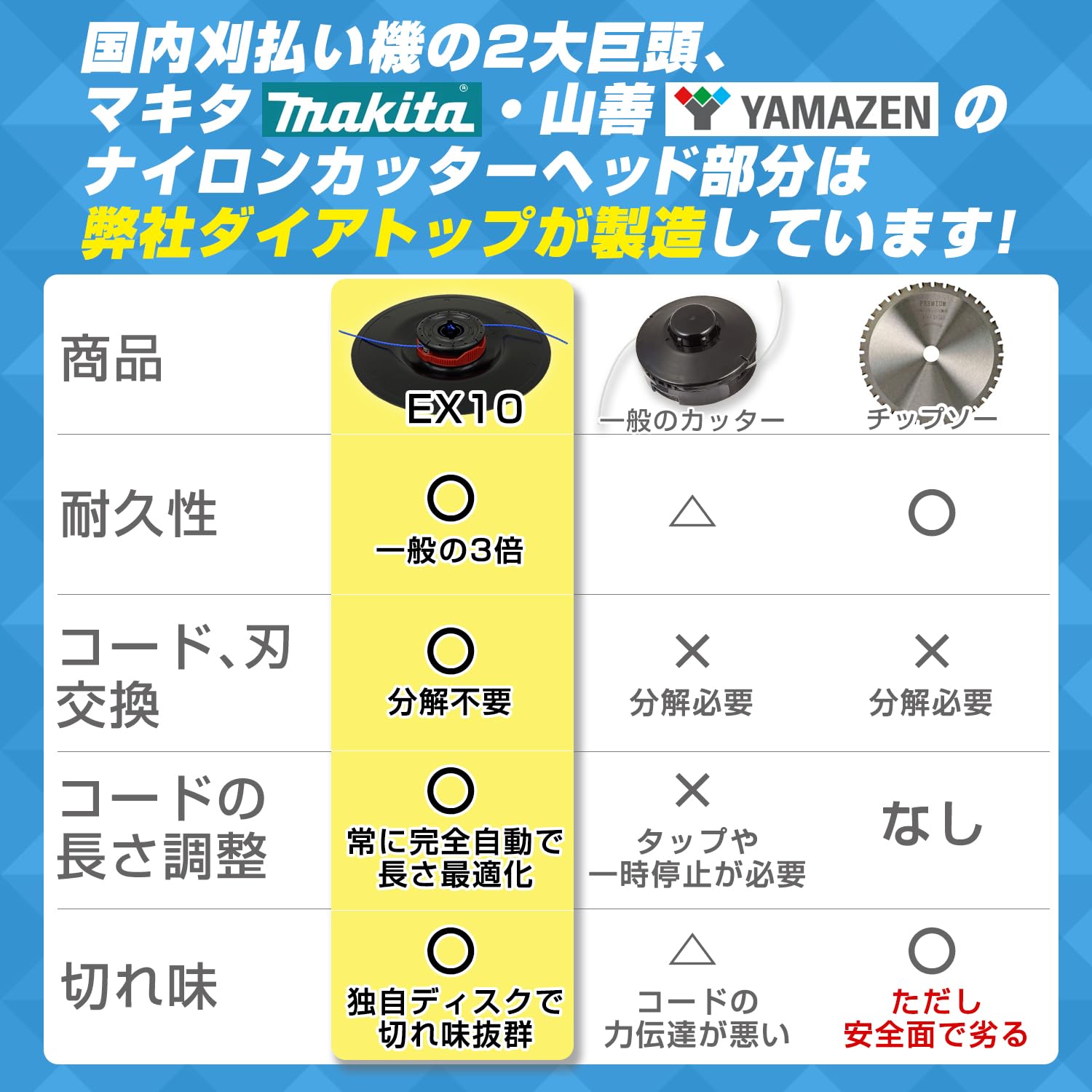【新春セール】DIATOP ナイロンコードカッター 自動繰り出し式 EX10 ハット付き 10インチ(直径26cm) フルオート 予備パーツ付き ダイアトップ ほぼ全ての国内電動 刈払い機対応 草刈り 替え刃 芝 壁際 低騒音 静音 ブレード 薄型 軽量 石 タイル ワイヤー 雑草 よもぎ せいたか草 ススキ 除草 | ニコニコSHOP