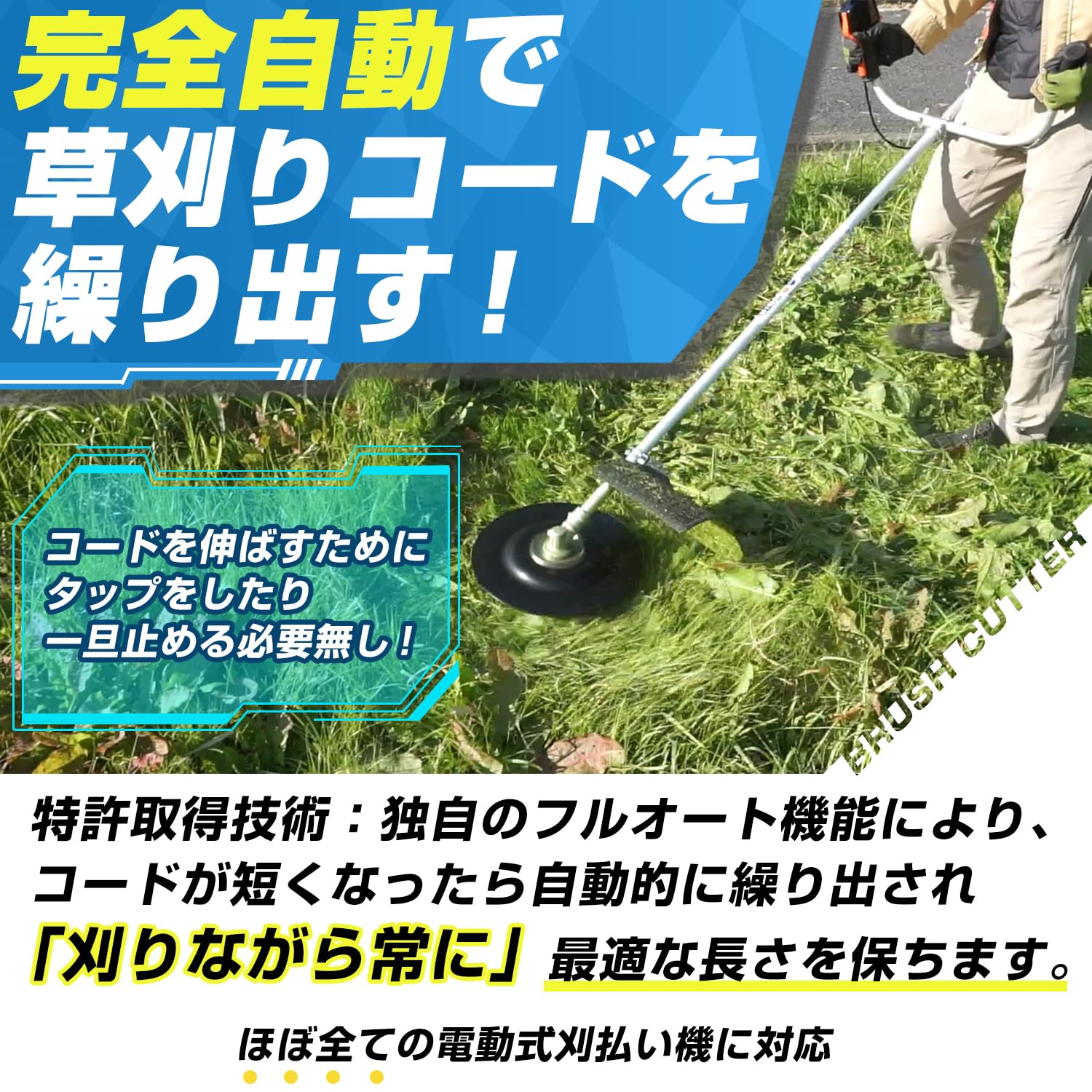 【特徴】 ・国内ほぼ全ての一般的な電動式刈払機(36V以下推奨)に使用可能なナイロンコードカッターです。(一部使用できない機種があります) 連続作業ができるフルオート繰り出し式なので、作業中ナイロンコードが短くなるとコードが自動的に繰り出されます。 ・弊社独自のディスク形状により先端部のコード長さが保たれ切断性能が飛躍的に向上します。また飛散防止効果もあります。
