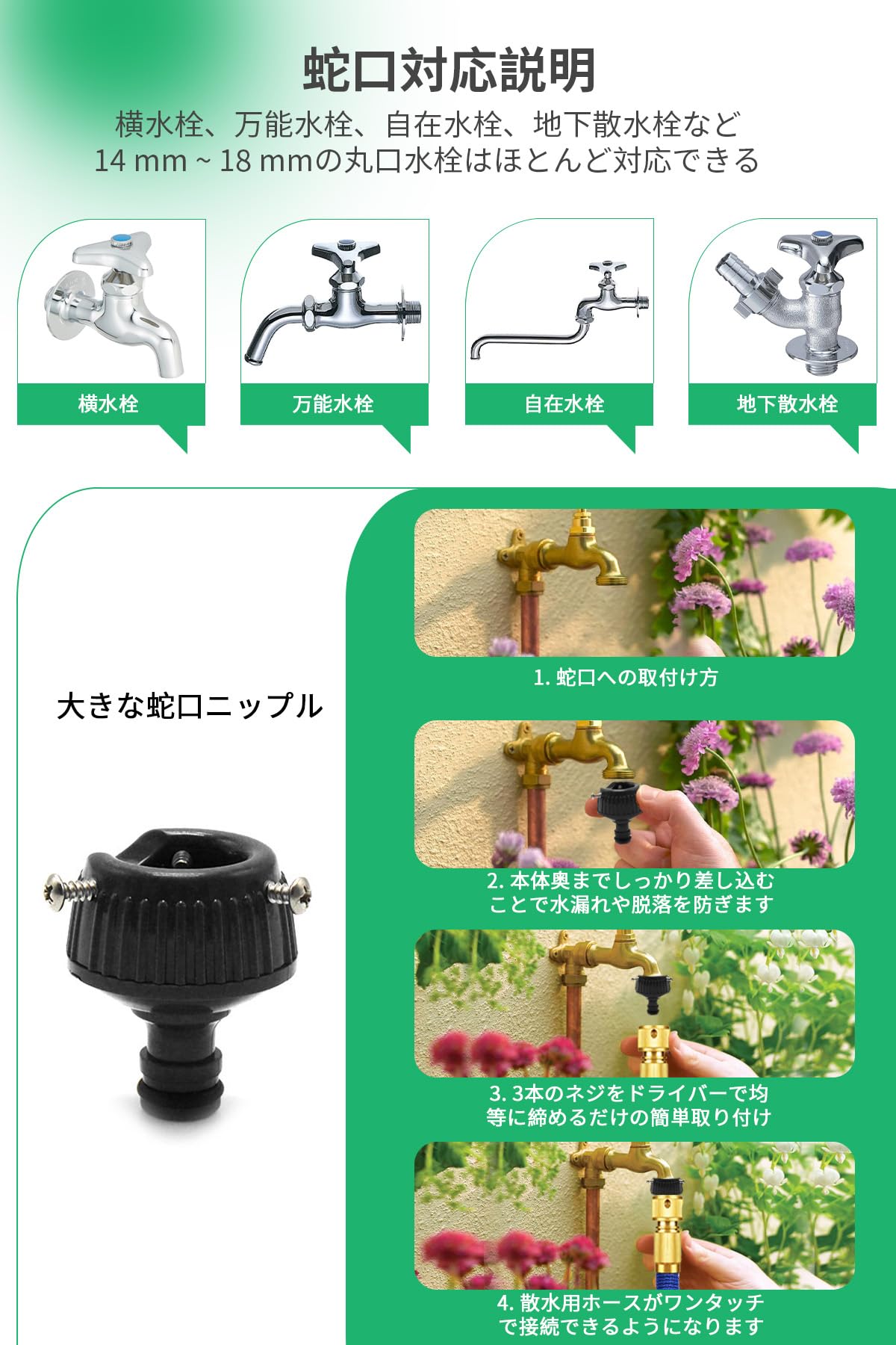 【10種類の散水モード&使いやすい散水ノズル】 散水ホースのノズルは10-in-1設計で、10種類の散水モードがあり、使用シーンに応じて散水モードを切り替えることができます。 例えば、庭の花の水やり、洗車、地面のコケ掃除などの場合、水圧と散水量を切り替えることで効果を発揮します。 また、スイッチを長押しする必要がない設計なので、長時間使用しても手のひらが疲れにくいです。 散水ノズルのハンドルには滑り止め加工が施されており、水に触れても落ちにくいです。 ホースのノズルも使いやすさを追求したデザインです。