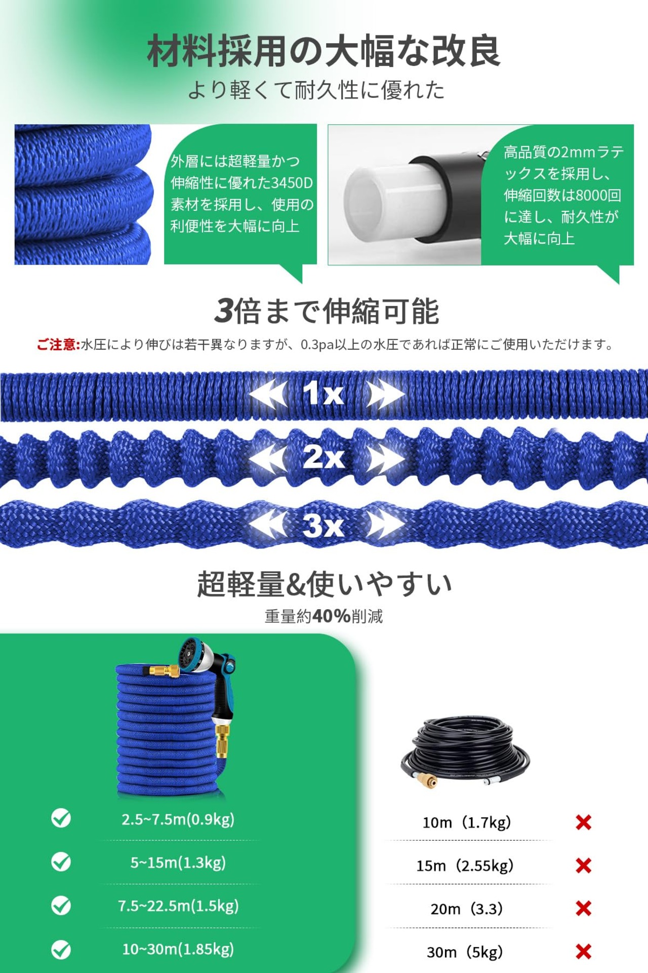 【高品質ラテックスを採用&優れた伸縮性】3倍伸縮ホースは、従来品を改良しました。 伸びるホース内層には伸縮性と回復性に優れた高品質2mmラテックスを採用し、伸縮ホースの耐久性と使用時の伸縮速度が向上しました。 外層は耐摩耗性に優れた3450D素材で作られており、伸びるホースが硬い路面を引きずったときに内側のラテックスが傷つくのを防ぐ。 また、伸縮ホースは-10℃~60℃の環境下で1~3倍の長さに伸ばすことができます。多くの地域で、いつでも問題なく使用できる。