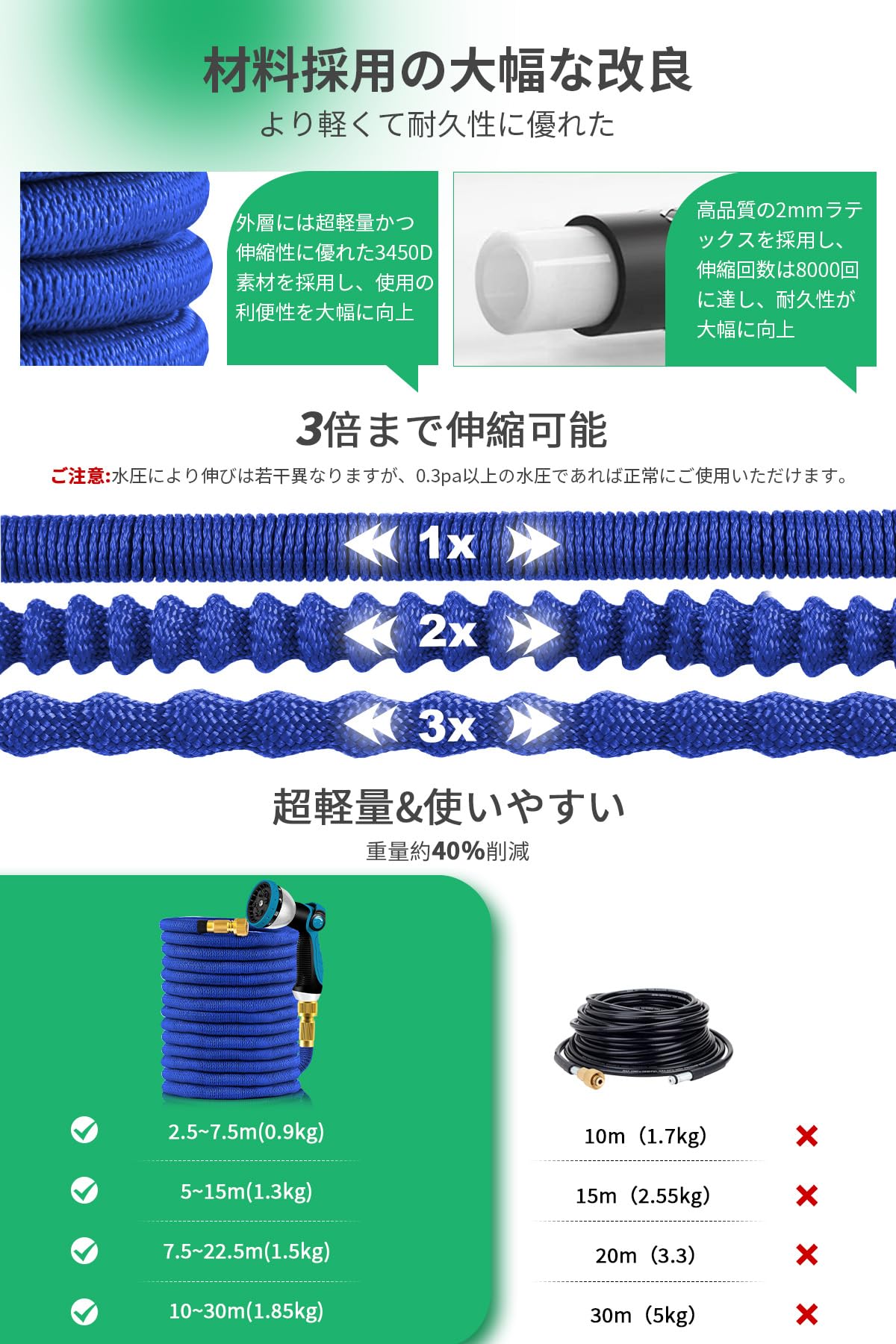 【改良された金属部品&優れた耐久性】 Yofidra ホースは部品がプラスチックコネクタから金属コネクタに改良しました。 金属部品の採用により、散水ホースの耐久性が大幅に向上。うっかり落としてコネクタを破損する心配がなく、いつでも安心して使用できる。また、金属部品を使用しているにも関わらず非常に軽い散水ホースです。2.5~7.5mのサイズはわずか0.97kg、5~15mのサイズはわずか1.38kg、7.5~22.5mのサイズはわずか1.82kg、10~30mのサイズはわずか2.3kgです。市販のビニール ホースに比べて40%軽く、お年寄りや子供でも使いやすい。 耐久性と軽量性を兼ね備えたホースです。