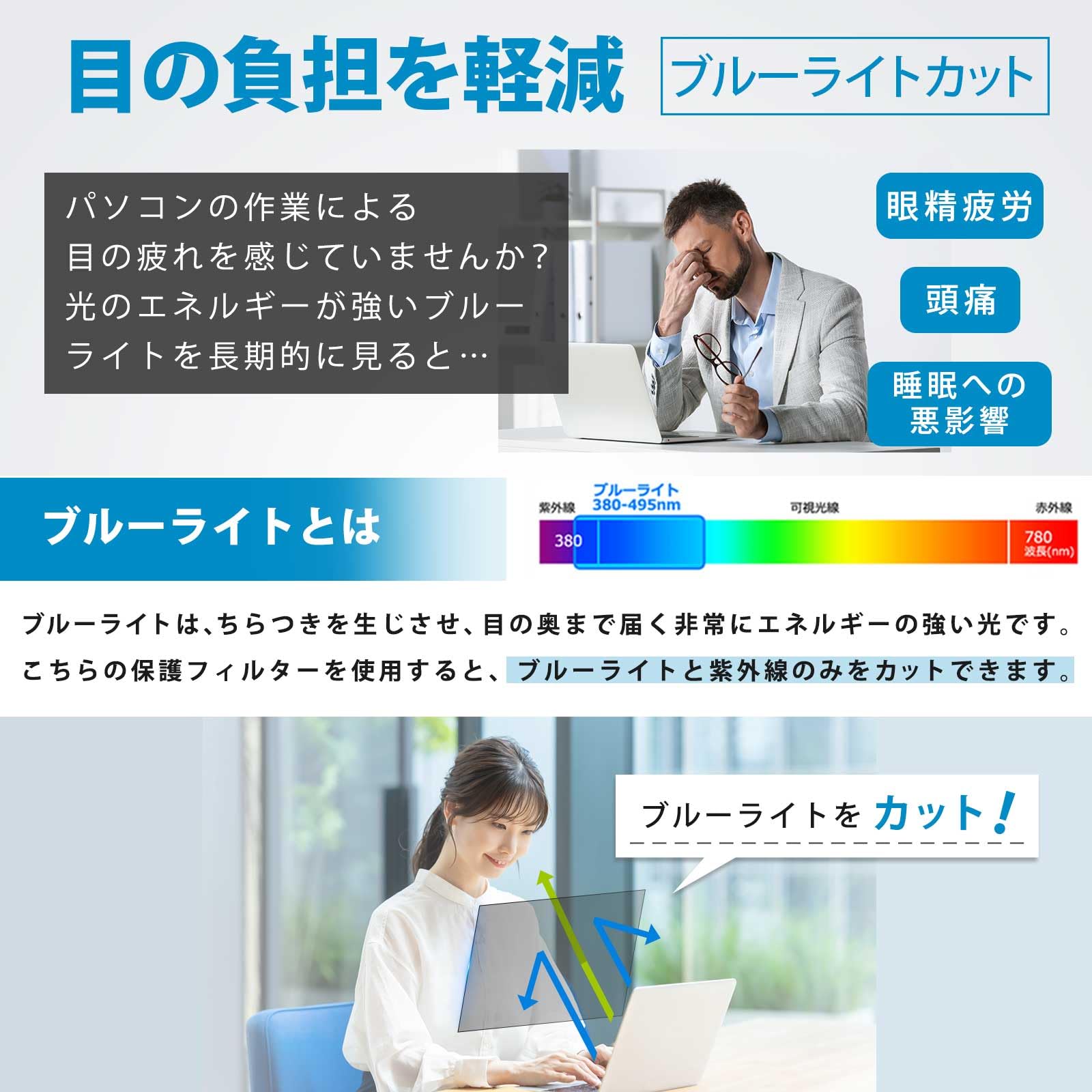 ブルーライトをカット:ブルーライトを約48%、紫外線を99%減少させます。 傷から画面を保護:フィルターの硬度は3Hの硬度なので、傷から画面を守ることができます。