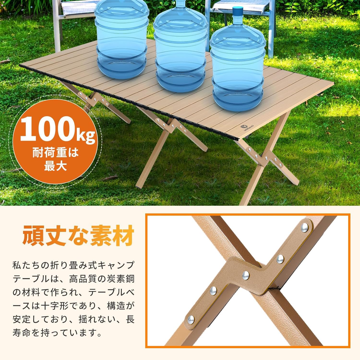 独自のスタイリッシュ風:特徴的なX型の支持構造により、このテーブルは安定性を保ちつつ、広い支持面積を提供し、耐荷重能力を高めています。木目調の天板は美しく自然なデザインで、屋外や室内の環境に上品な雰囲気を醸し出し、アクティビティをさらに楽しいものにします。あなたのキャンプやパーティーに独自の魅力を加えます。