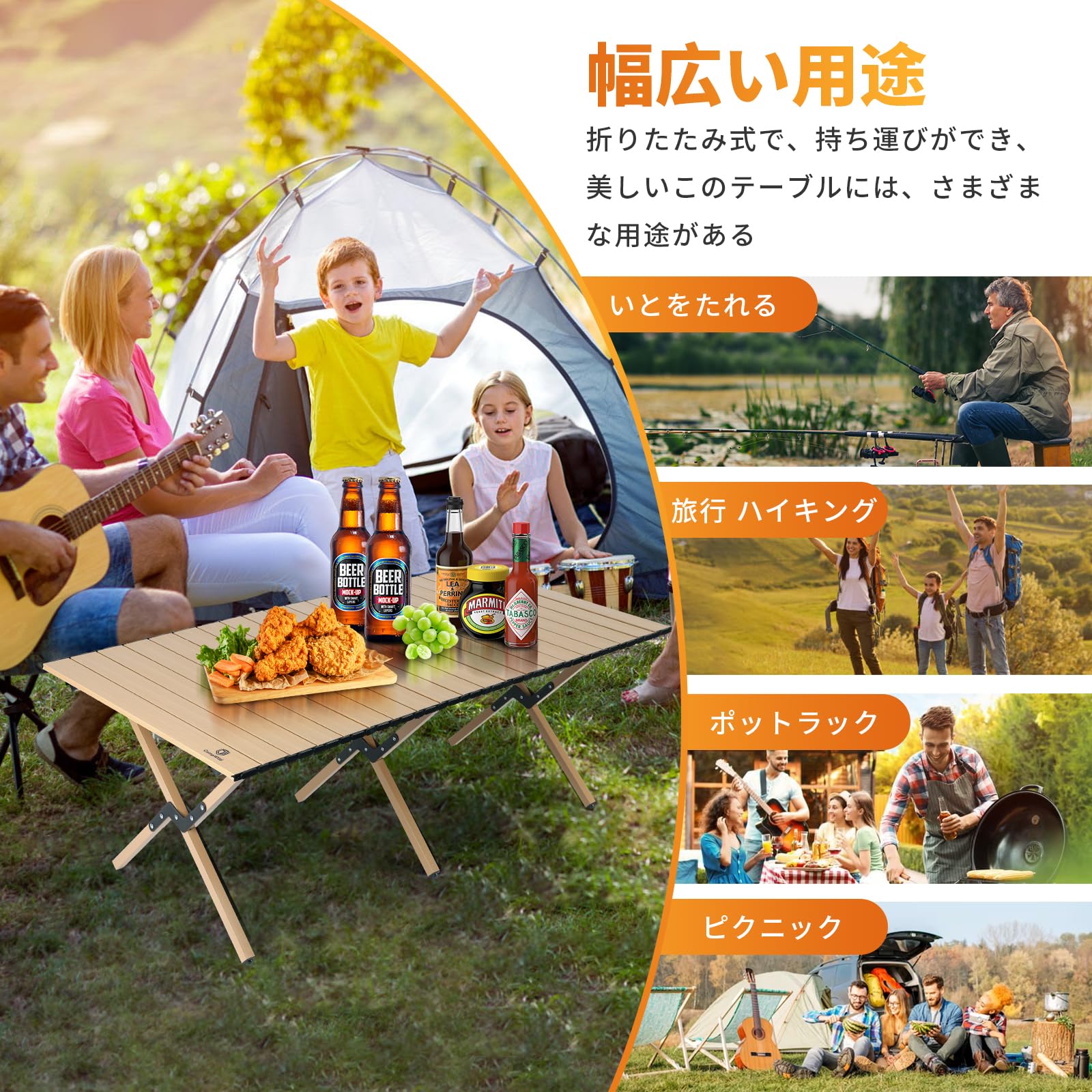 便利で多機能なデザイン:この折りたたみ式キャンプテーブルは、幅120cm、長さ60cm、高さ45cmというサイズで、アウトドアキャンプやハイキング、バーベキューなどの屋外アクティビティだけでなく、室内のダイニングテーブルやパーティーでも活躍します。屋外の自然環境でも、屋内の快適な場所でも、様々な用途で利用できます。