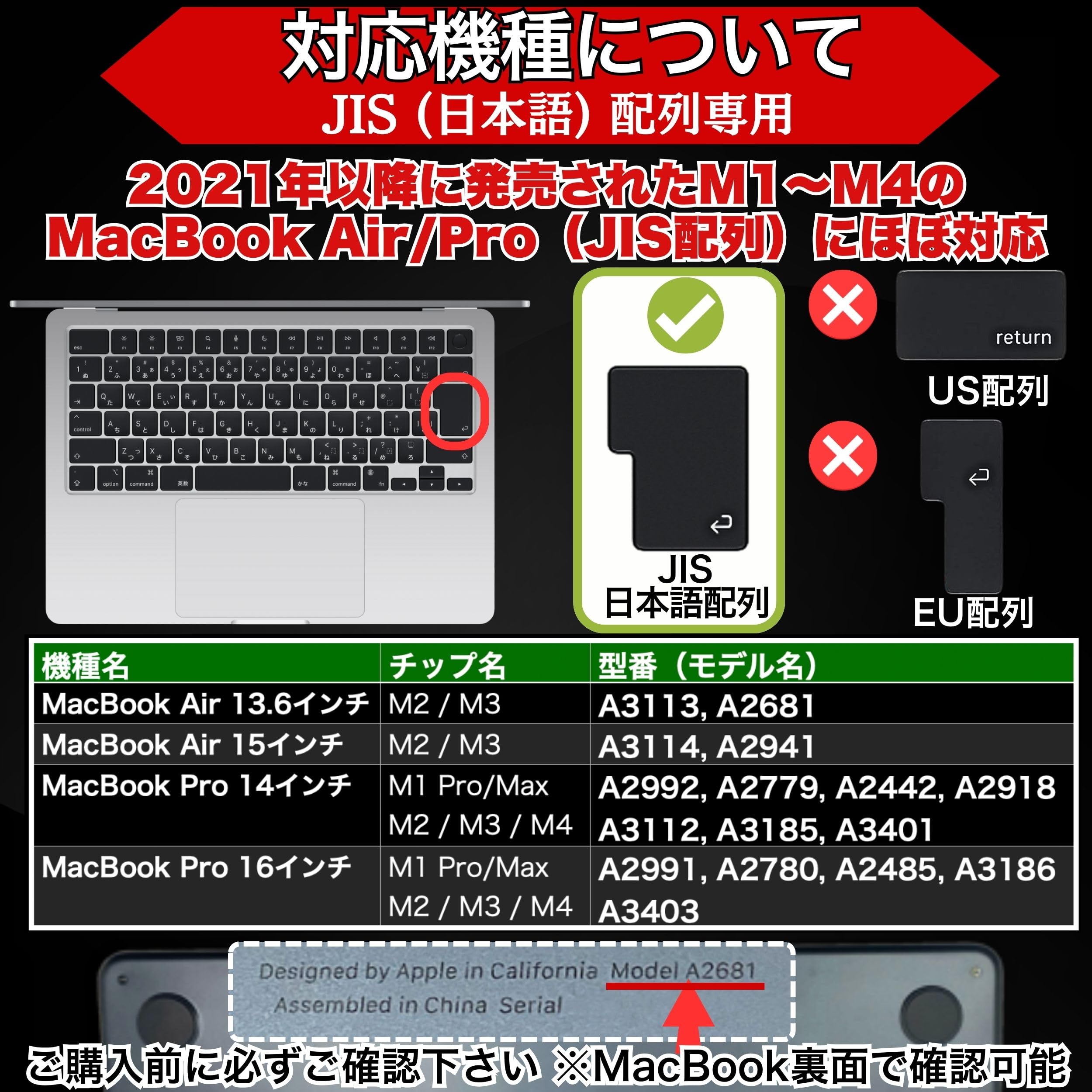 【対応モデル多数】MacBook Air 13.6 / 15インチ、Pro 14 / 16インチ(JIS配列)に対応。A3113 / A3114 / A2991 / A2992 / A2779 / A2780 / A2442 / A2485 / A2941 / A2681 / A2918 / A3112 / A3185 / A3186 / A3401 / A3403 など、最新のM1〜M4チップ搭載(Appleシリコン)MacBook Air / Proに幅広く対応。お使いのモデルにぴったり合うカバーを選べます。