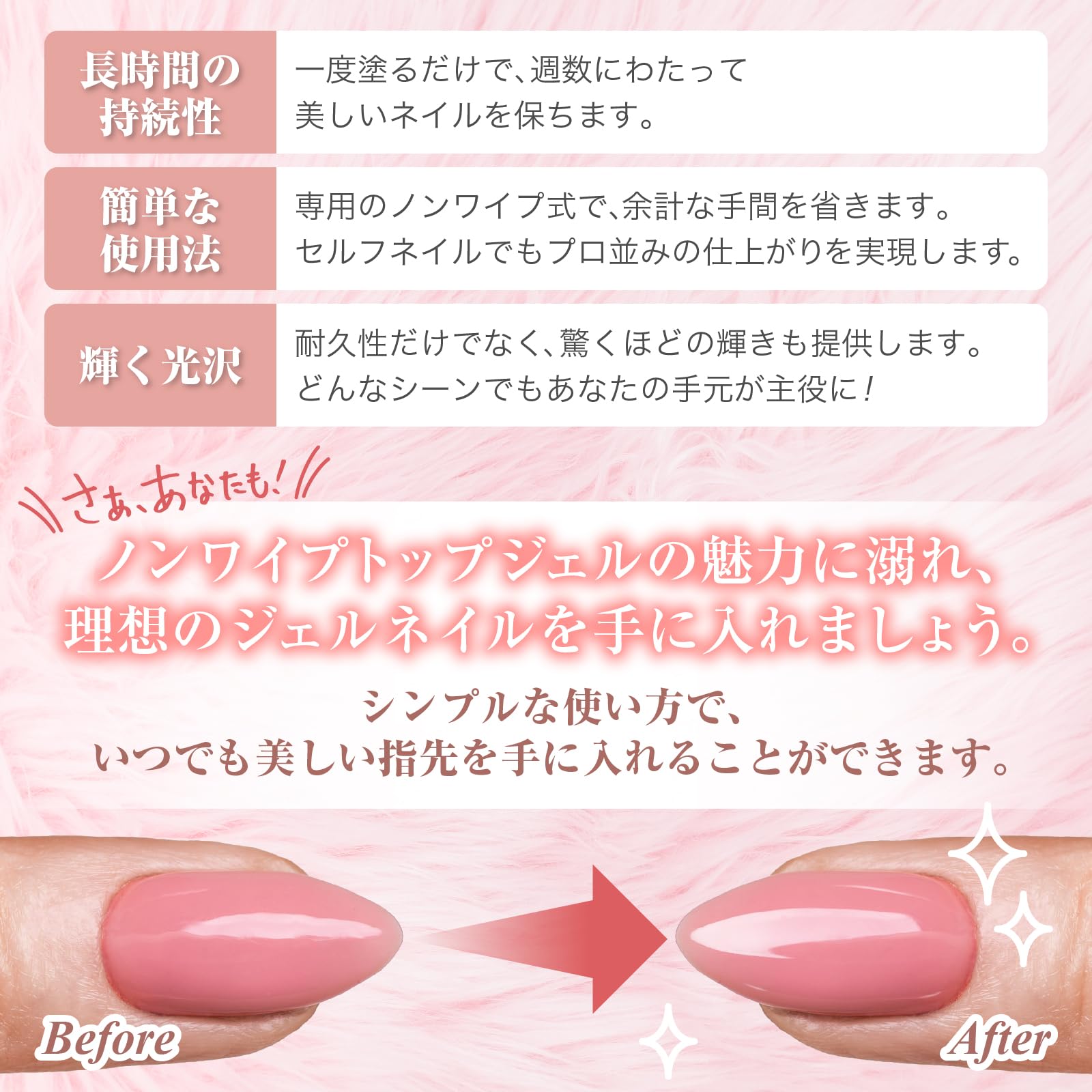 美しさと艶を満足いただけます。プロ仕様で固めにより艶をより高め液だれしない操作性ばつぐんのノンワイプトップジェル! 拭き取り不要で時間短縮!