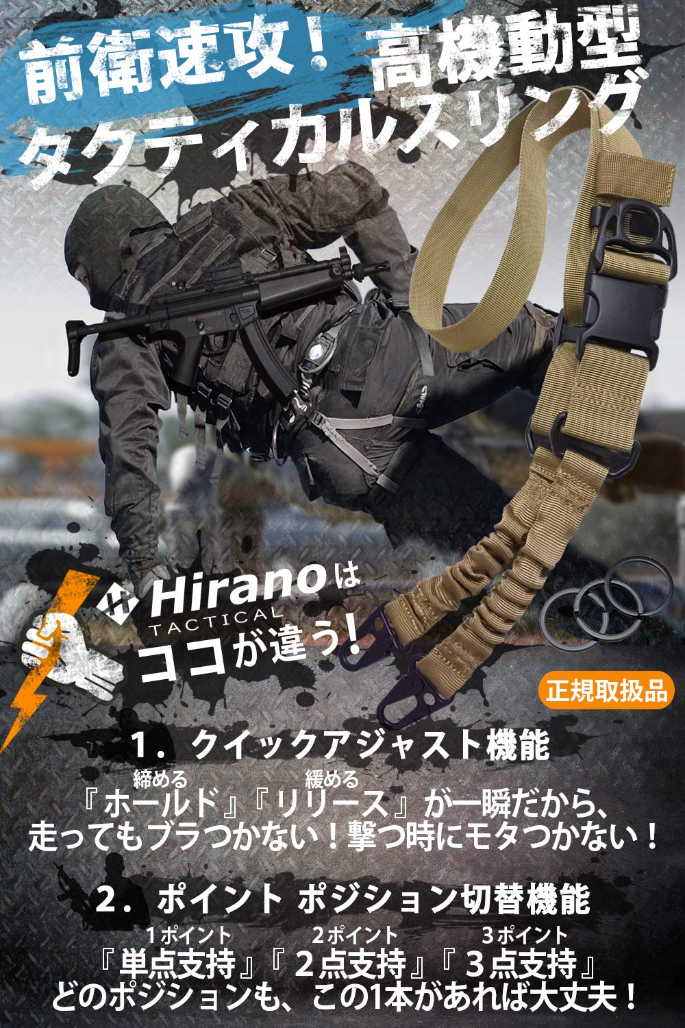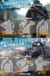 【クイックアジャスト機能搭載】1アクションでスリングの長さが調整可能なクイックアジャスト機能。ストラップを引っ張るだけで銃本体を素早くホールド!リリース時もDカンを引っ張るだけで瞬間AIMが可能。