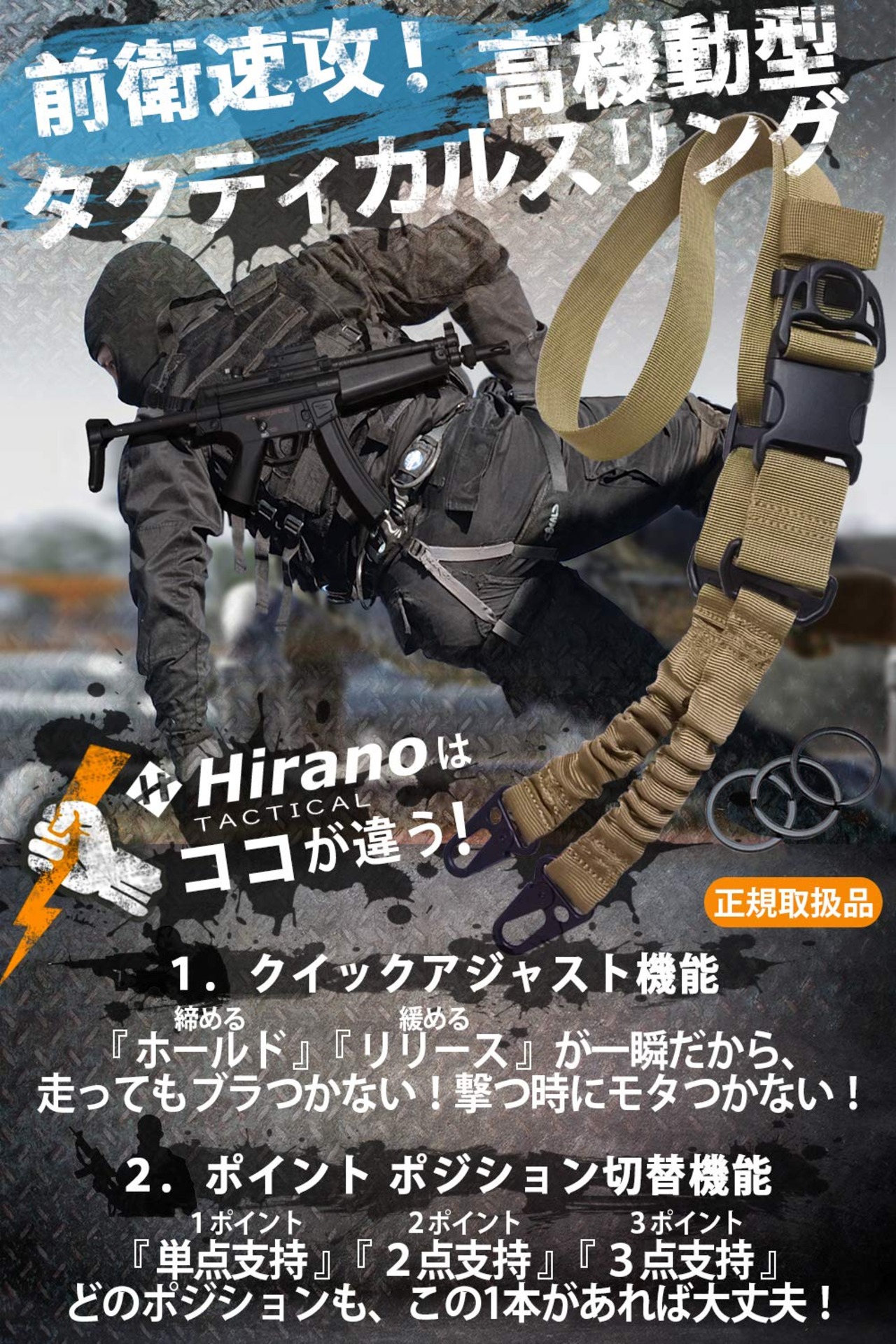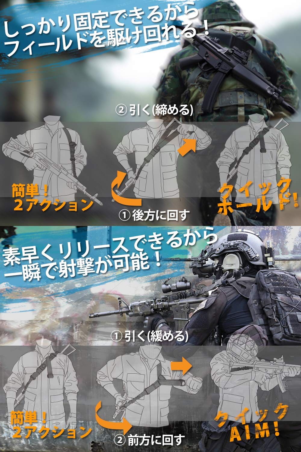 【前衛速攻の超アタッカー用スリング】ホールド機能で銃を固定したら敵陣営の襲撃ポイントへスピードダッシュ!クイックリリースで素早くAIM態勢をとったらトリガーを引くだけ!機動力を生かした戦術が可能に!