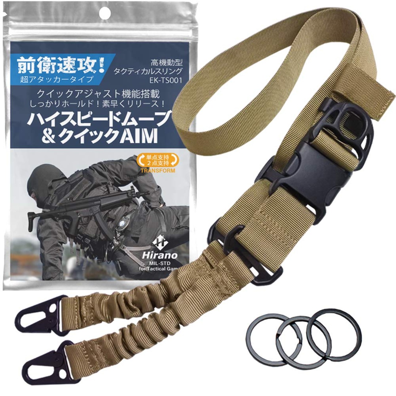 [HIRANOタクティカル]エアガン用スリング サバゲー ミリタリースリング タクティカルスリング 単点支持 2点支持 3点支持 EK-TS001カーキ